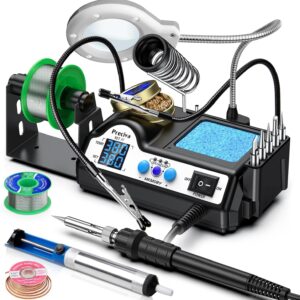 Die Preciva 927 IV Lötstation mit 130W Leistung richtet sich an ambitionierte Hobbylöter, Elektronik-Bastler und Werkstätten, die präzise Lötarbeiten an Platinen und elektronischen Bauteilen durchführen. Mit digitaler Temperaturregelung von 90-480°C, LCD-Display und umfangreichem Zubehör inkl. Lupenhalterung bietet sie professionelle Ausstattung zum fairen Preis. Ideal für alle, die von einfachen Kabellöten bis zu filigranen SMD-Arbeiten einen vielseitigen Lötplatz benötigen.