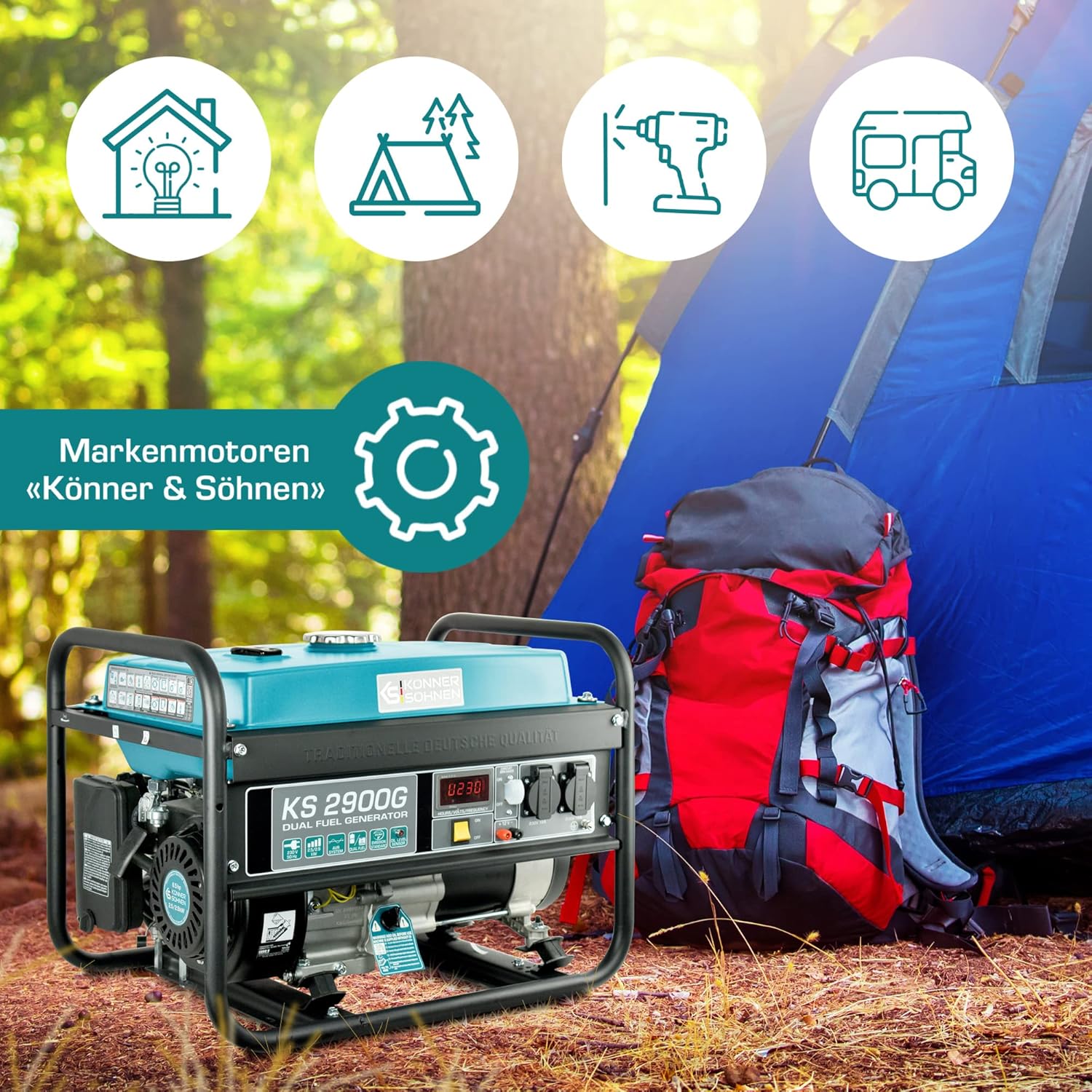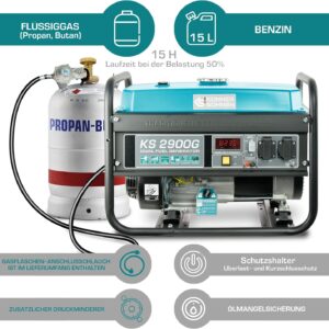 Der LPG/Benzin-Generator KS 2900G ist die ideale Lösung für Handwerker, Baustellenleiter und private Anwender, die eine flexible und kosteneffiziente Stromversorgung für den netzunabhängigen Betrieb benötigen. Mit seiner Dual-Fuel-Technologie bietet dieses Notstromaggregat maximale Freiheit durch den wahlweisen Betrieb mit Benzin oder Flüssiggas. Damit bist du auch bei Engpässen in der Kraftstoffversorgung stets einsatzbereit.