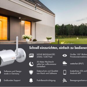 Die Kamera zeichnet Videos in hochauflösender Qualität mit 2560 x 1440 Pixeln (4MP) auf. Ein großer Blickwinkel von 90° sorgt dafür, dass Sie einen weiten Bereich im Blick behalten. Zudem stehen moderne Bildverbesserungsfunktionen und verschiedene Komprimierungsstandards wie H.265 zur Verfügung, um eine optimale Balance zwischen Bildgüte und Speicherplatzbedarf zu erzielen.