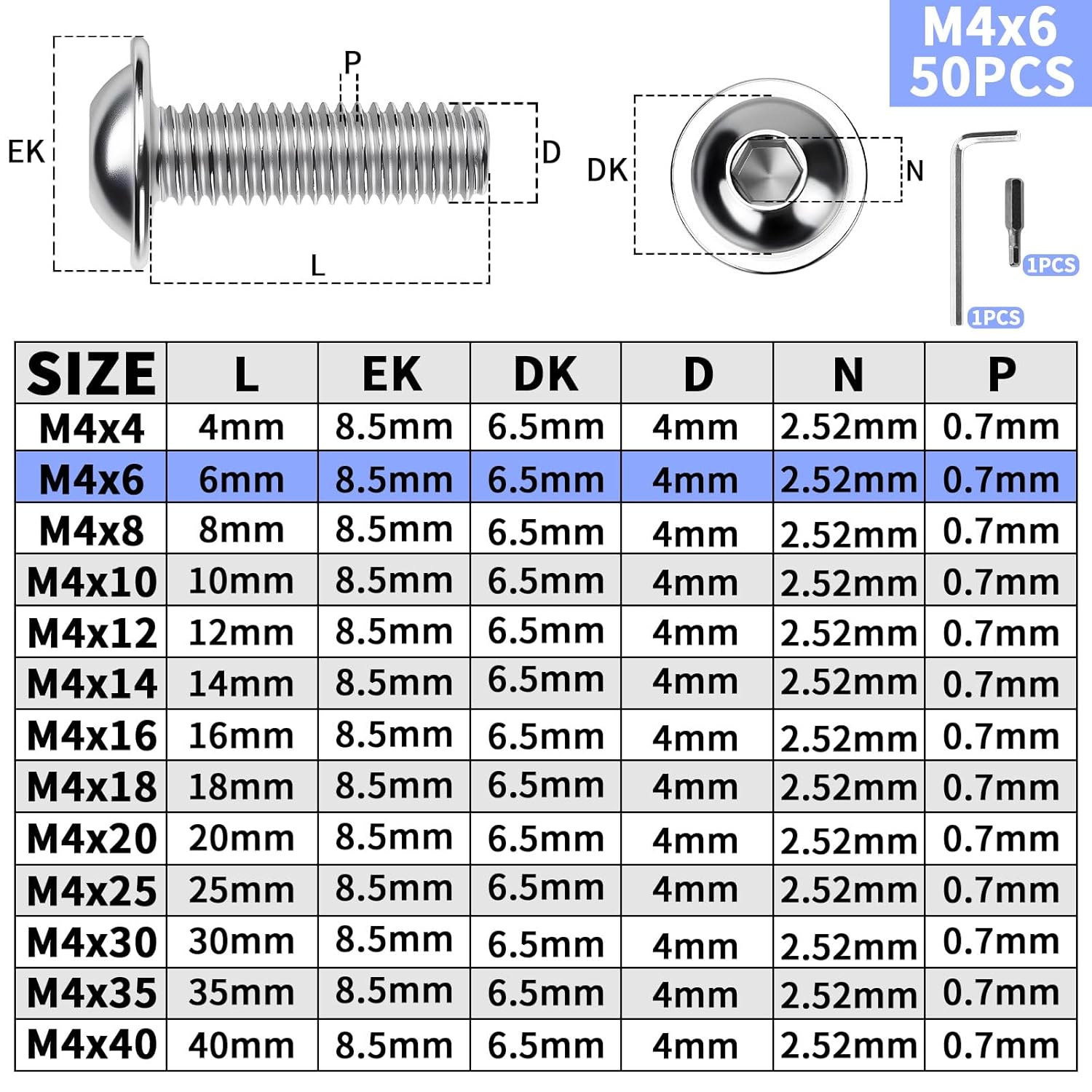 Die Schrauben haben einen Gewindedurchmesser von M4 und eine Gewindelänge von 6 mm. Sie entsprechen der Norm ISO 7380-2, was eine präzise Passform bei entsprechenden Anwendungen sicherstellt.