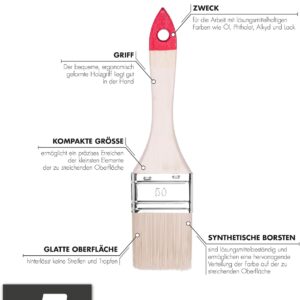 Materialien und Untergründe: Die Synthetikborsten sind optimal für Holzlasuren, Holzöle, Alkydlacke und Ölfarben auf verschiedenen Materialien. Du kannst damit Holzmöbel, Holzfenster und Türen ebenso bearbeiten wie Metallgitter, Heizkörper, PVC-Fensterrahmen, Beton und Fliesen. Für wasserbasierte Dispersionsfarben an Wänden funktionieren die Pinsel ebenfalls, allerdings sind sie primär für Lösungsmittellacke konzipiert.