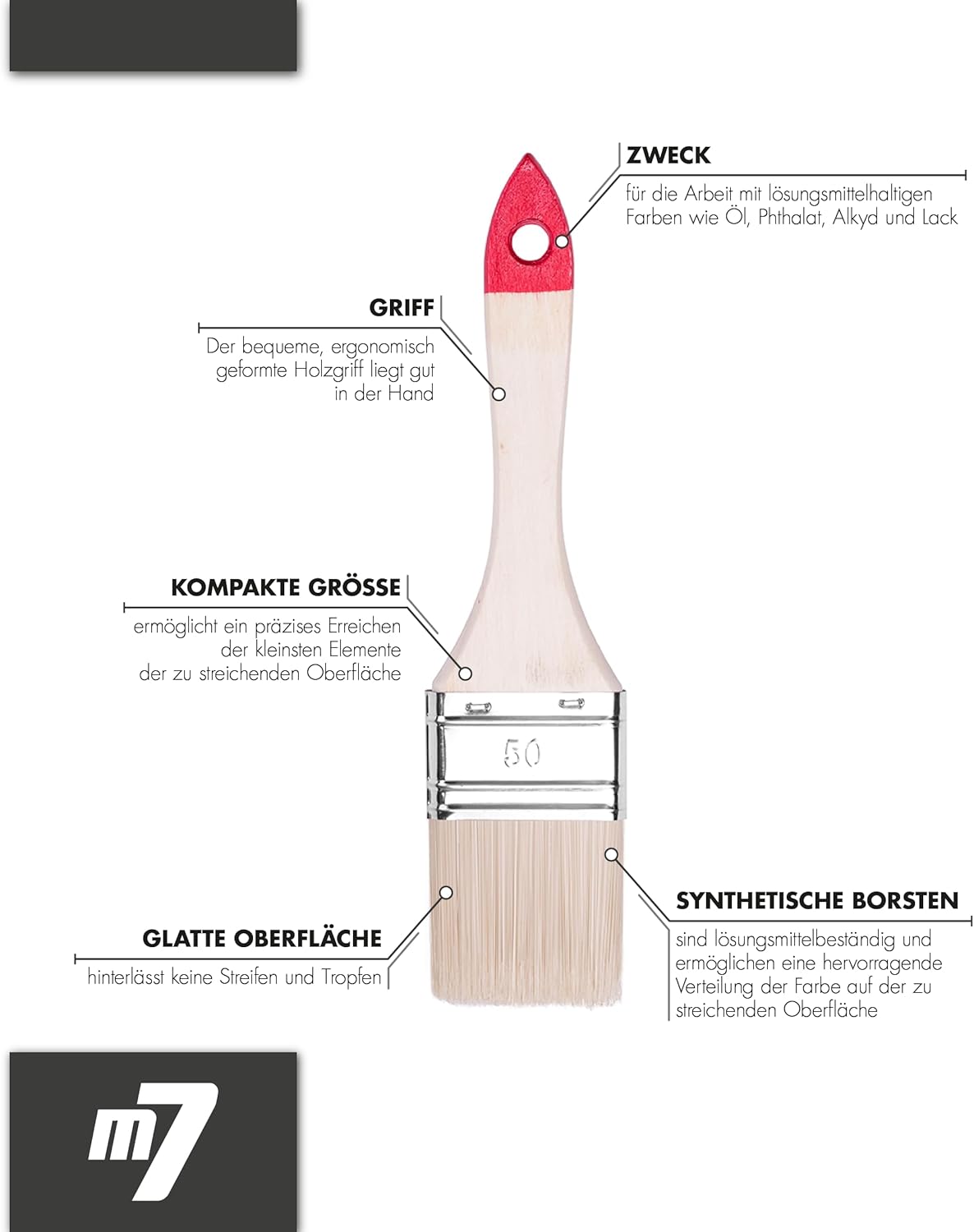 Das M7 15 STK. Flachpinsel-Set richtet sich an Maler, Heimwerker und Handwerker, die beim Streichen und Lackieren auf ein durchdachtes Sortiment setzen. Mit drei verschiedenen Pinselbreiten (1″, 1,5″ und 2″) in jeweils fünffacher Ausführung hast du für Renovierungsarbeiten, Möbelrestaurierung und Bauprojekte immer den passenden Pinsel zur Hand. Die synthetischen Borsten eignen sich besonders für lösungsmittelhaltige Lacke und Ölfarben auf nahezu allen Untergründen.
