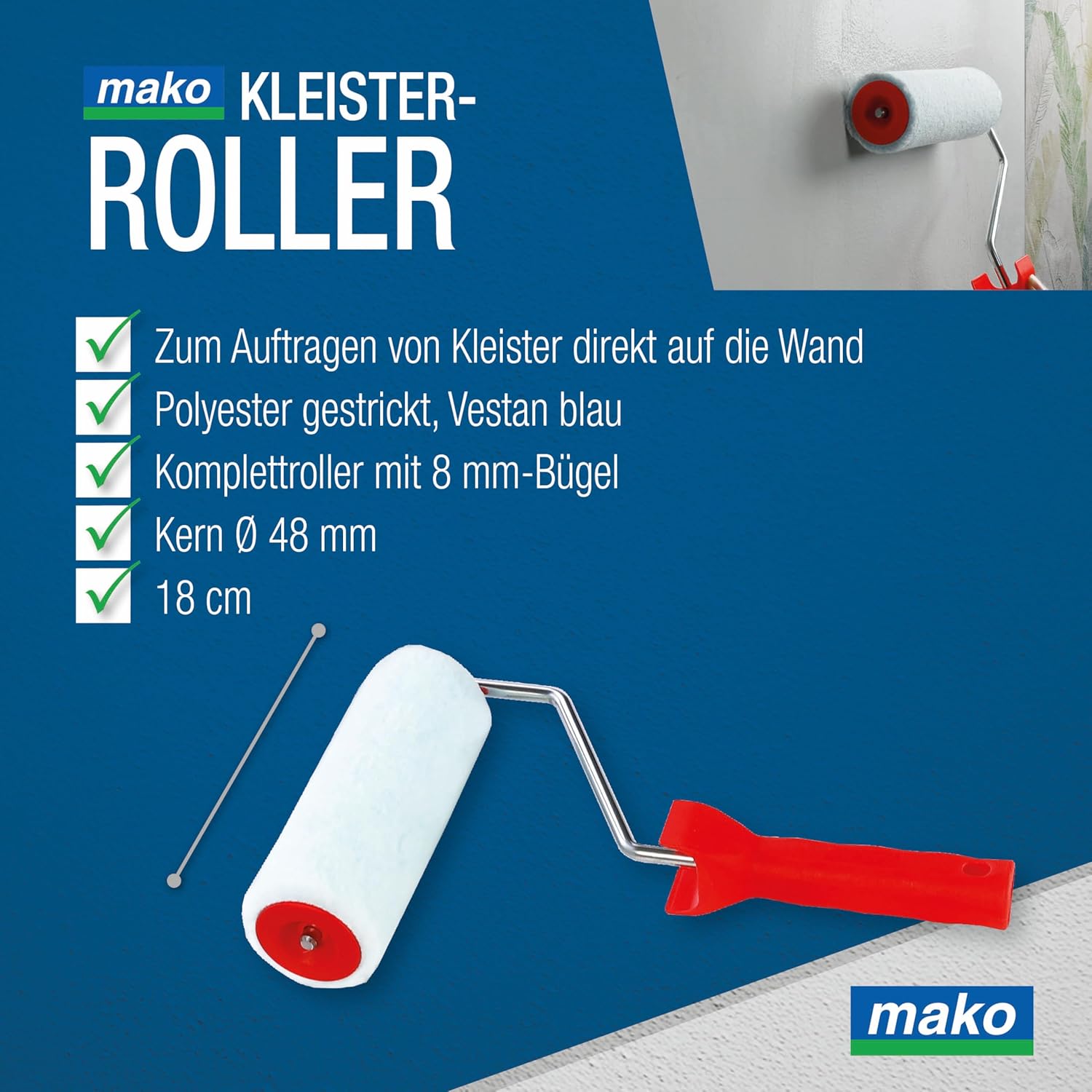 Ja, der 18 cm breite Kleisterroller von mako ist so konzipiert, dass er ein spritzfreies Auftragen des Kleisters direkt auf die Wand ermöglicht. Durch den ergonomischen Griff liegt das Werkzeug zudem sicher in der Hand, was das Arbeiten besonders effizient und sauber macht.
