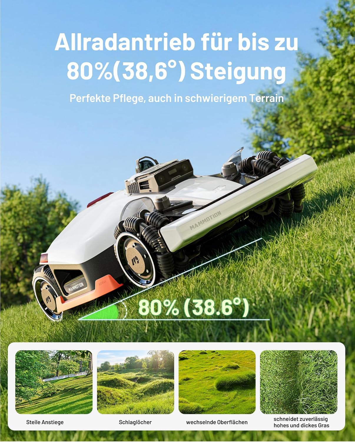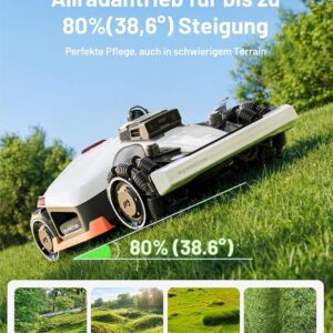 - Meistert extreme Steigungen: Mit Allradantrieb und vier Einzelradmotoren bewältigt der LUBA 3 AWD Steigungen bis 80% (38,6°) – ideal für Hanggärten und unebenes Gelände
