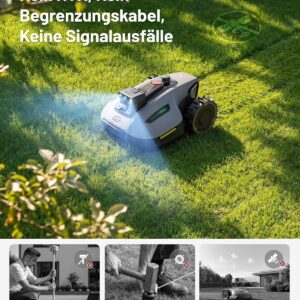 - Präzise 3-Kamera-Navigation: Mit zwei seitlichen Monokameras und einer zentralen RGB-Kamera erkennt der Mäher Rasengrenzen und Hindernisse zentimetergenau.