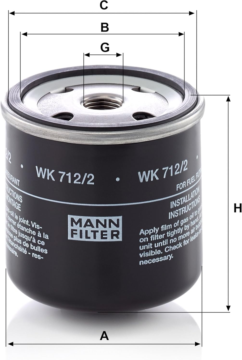 Der MANN-FILTER WK 712/2 besitzt die Maße A = 76 mm, B = 62 mm, C = 71 mm und H = 80 mm. Zudem ist das Anschlussgewinde mit G = M16x1.5 spezifiziert, was eine präzise Passform für die entsprechenden Fahrzeugmodelle gewährleistet.