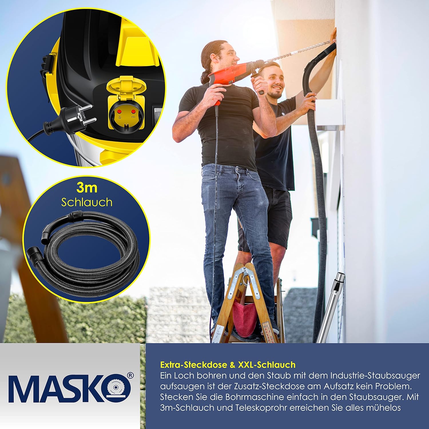Die integrierte Steckdose am MASKO Staubsauger ermöglicht das gleichzeitige Anschließen von Elektrowerkzeugen wie Bohrmaschinen. So können Sie während des Bohrens direkt absaugen und die Staubentwicklung minimieren. Dies ist besonders praktisch, wenn nur eine Wandsteckdose verfügbar ist.