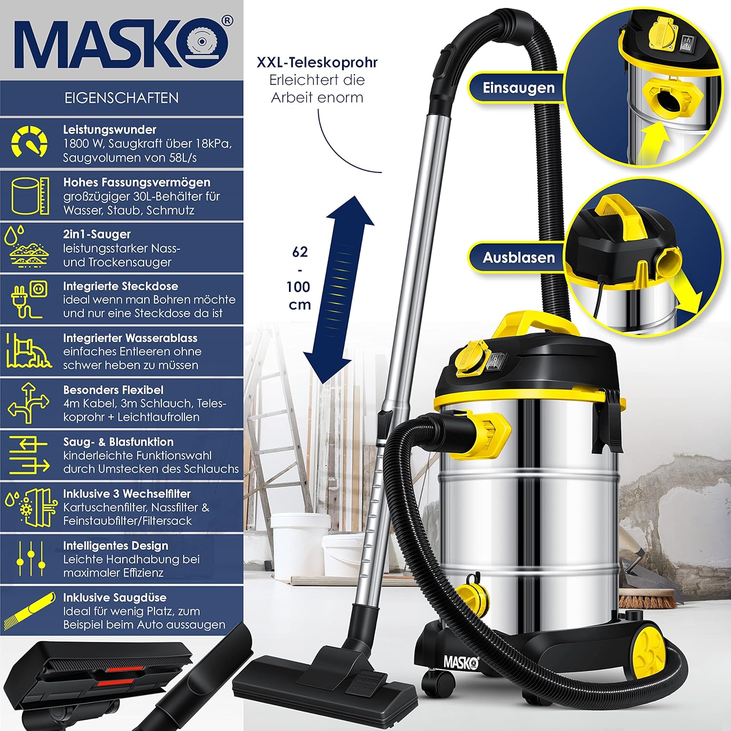 Der MASKO Industriestaubsauger wird mit umfangreichem Zubehör geliefert: einem 3m Saugschlauch, Teleskoprohr, verschiedenen Düsen für unterschiedliche Einsätze und drei Wechselfiltern. Zusätzlich verfügt das Gerät über ein 4m Stromkabel für großen Aktionsradius. Der antistatische Saugschlauch verhindert elektrostatische Aufladung während des Betriebs.