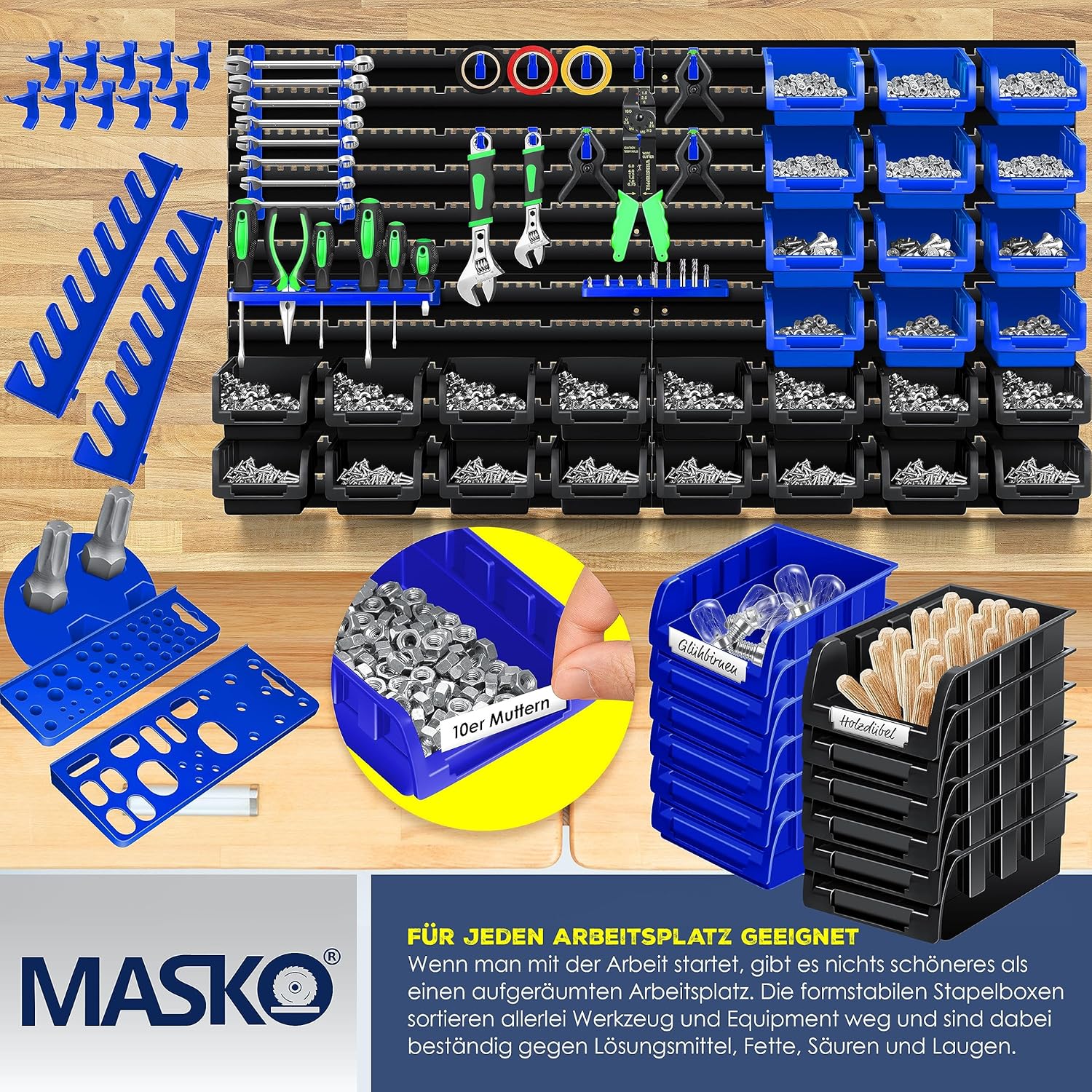 Mit dem MASKO® System investierst du in einen strukturierten Workflow. Die Montage ist selbsterklärend: Wandplatte ausrichten, festschrauben, Boxen einhängen und loslegen. Wer den Platz effizient nutzen will, findet hier die ideale Lösung für komplexe Werkstatteinrichtungen.