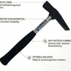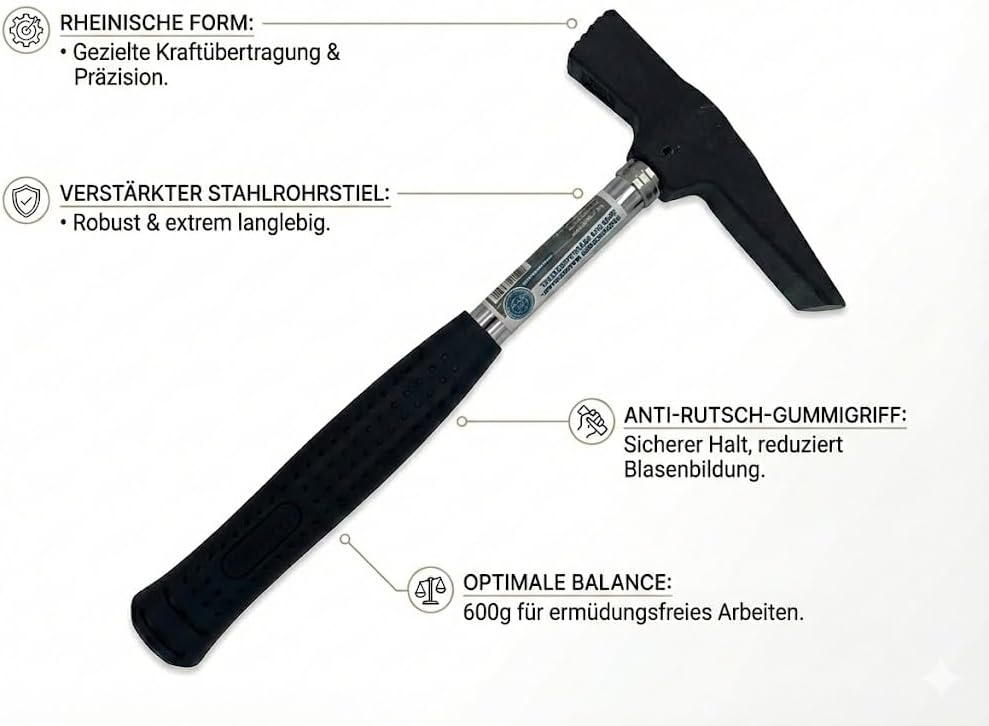 Unsere Kunden berichten immer wieder, dass gerade die Kombination aus dem stabilen Stahlrohrstiel und der rheinischen Form für den Baualltag genau das richtige Setup ist. Viele Nutzer loben, dass der Hammer „nicht unnötig schwer“ ist und deshalb auch für längere Arbeiten über Kopf nicht zu sehr belastet.