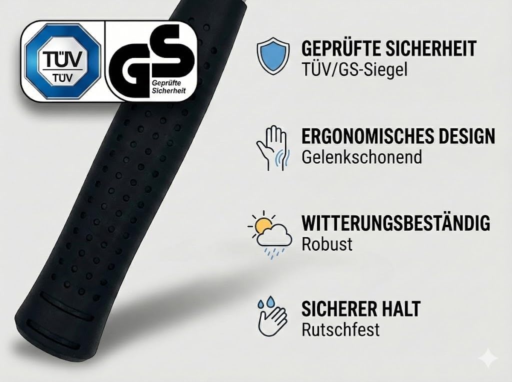 - TÜV/GS geprüft: Damit hast du die Sicherheit, dass das Werkzeug unter Belastung hält und keinen plötzlichen Materialbruch zeigt.
