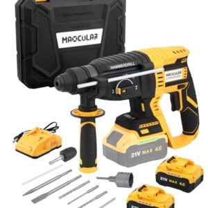 MAXCULAR Akku Bohrhammer 21V, 2,0J Schlagkraft, 4in1 SDS-Plus 5100 BPM, 26 mm Betonbohrleistung, Bürstenlos, inkl. 2 * 4.0Ah Akku, 5tlg. Bohr-Meißel-Set, Ladegerät im Handwerkerkoffer