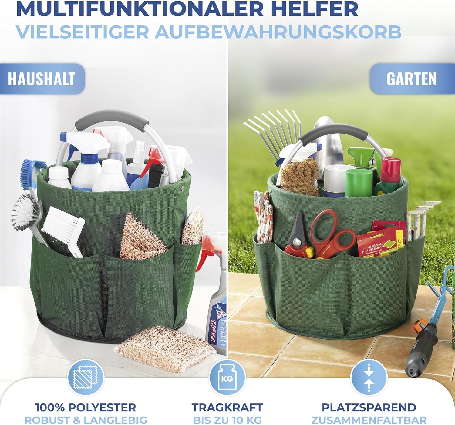 Ob im Garten, beim Picknick oder am Strand – dieser Caddy im 2er Set ist eine echtes Multitalent, wenn es gilt, viele Dinge ordentlich zu verstauen und sicher zu transportieren. Die Aufbewahrungsbox verfügt über ein großes Hauptfach und 6 Außentaschen, in denen Bürsten und Schwämme einen hervorragenden Platz finden. In diesem Aufbewahrungskorb finden alle Reinigungs- und Pflegemittel einen sicheren und griffbereiten Platz. Mit diesem Caddy in frischem Grün haben Sie alle Reinigungsmittel für
