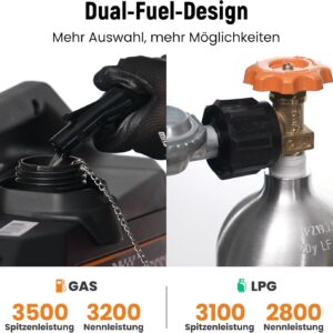 • Dual-Fuel-Flexibilität: Wähle zwischen Benzin und LPG per einfachem Umschaltvorgang, um Betriebskosten zu senken und die Laufzeit zu maximieren.