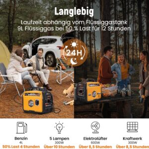 • Hohe Leistungsdichte: Mit bis zu 3500W Spitzenleistung im Benzinbetrieb lassen sich auch anspruchsvollere Verbraucher wie Klimaanlagen oder Kühlschränke betreiben.