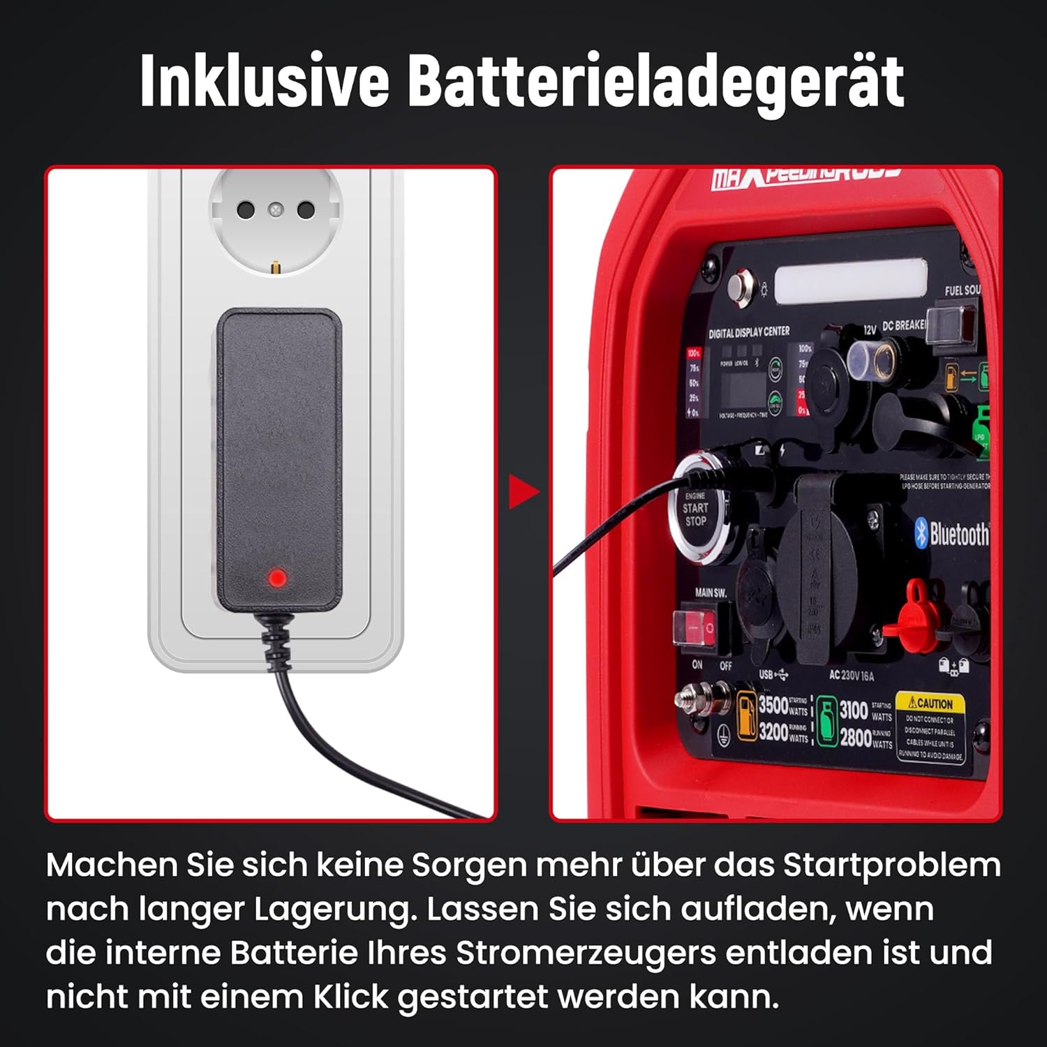 Falls die interne Batterie entladen ist und der Elektrostart nicht sofort funktioniert, ist das kein Problem. Der Generator wird mit einem Batterieladegerät geliefert, mit dem Sie die Batterie einfach wieder aufladen können, um den Komfort des Ein-Klick-Starts schnell wieder nutzen zu können.