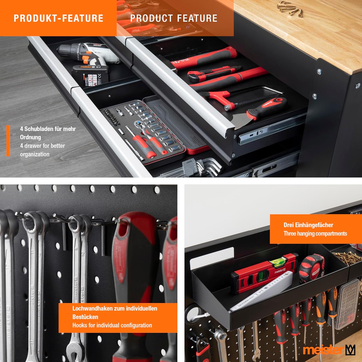 Die Werkbank verfügt über vier geräumige Schubladen für eine sortierte Werkzeugaufbewahrung und ein großes unteres Ablagefach für sperrige Gegenstände. Zudem ermöglicht eine praktische Werkzeuglochwand mit 20 mitgelieferten Haken sowie drei einhängbaren Ablagefächern eine übersichtliche Ordnung direkt am Arbeitsplatz.