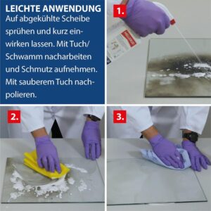 - Sprühe das Produkt gleichmäßig auf die abgekühlte oder handwarme Scheibe auf.