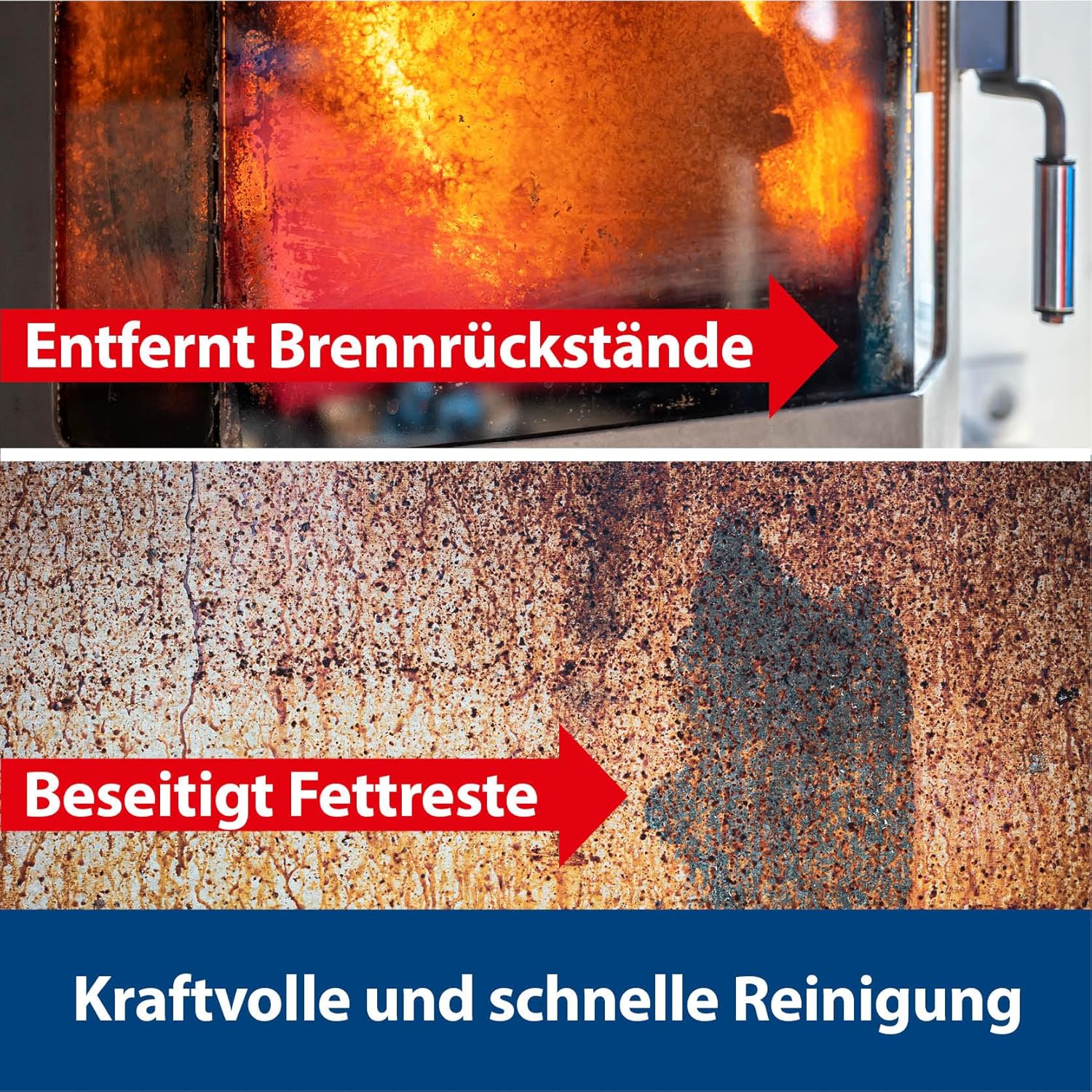 Der Reiniger ist primär für das Glas konzipiert, um Ruß und eingebrannten Schmutz effizient zu lösen. Bitte achten Sie darauf, dass das Produkt möglichst nur auf die Glasfläche trifft, da es für empfindliche Dichtungen oder spezielle Lackierungen von Metallteilen unter Umständen zu aggressiv sein könnte.