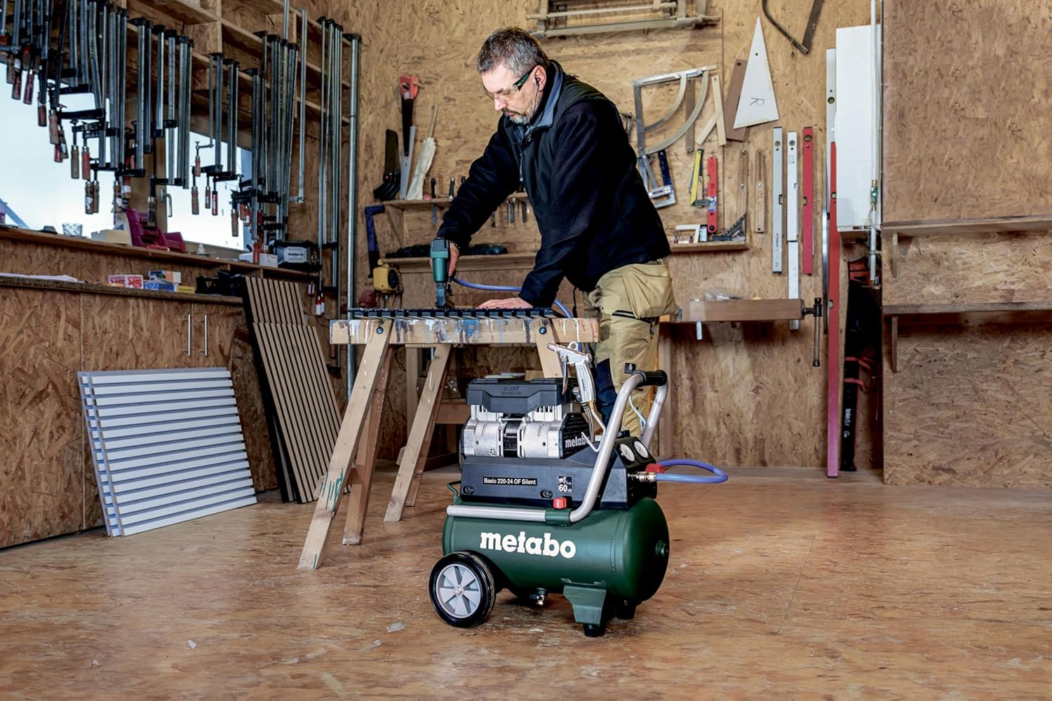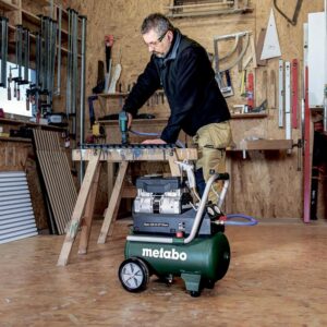 Der Metabo Kompressor Basic 220-24 OF Silent ist ideal für Tätigkeiten, bei denen Präzision und Ruhe gefordert sind. Schreiner und Möbelbauer nutzen ihn primär für den Betrieb von Tacker- und Nagelpistolen bei Montagearbeiten in Innenräumen. Hobby-Schrauber schätzen die Leistung bei Reinigungsarbeiten im Motorenbereich oder zum Aufpumpen von Reifen. Auch in kleineren Werkstätten, in denen Metall oder Kunststoff verarbeitet wird, eignet er sich hervorragend zur Bedienung von Ausblaspistolen oder kleineren Druckluftwerkzeugen. Aufgrund der 110 l/min Füllleistung ist das Gerät für klassische Werkstatt-Anwendungen optimiert – für den dauerhaften Betrieb großkalibriger Schlagschrauber oder Sandstrahlkabinen stößt das Modell jedoch an seine physikalischen Grenzen.