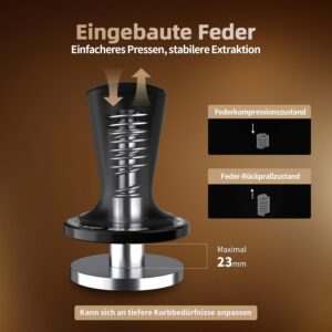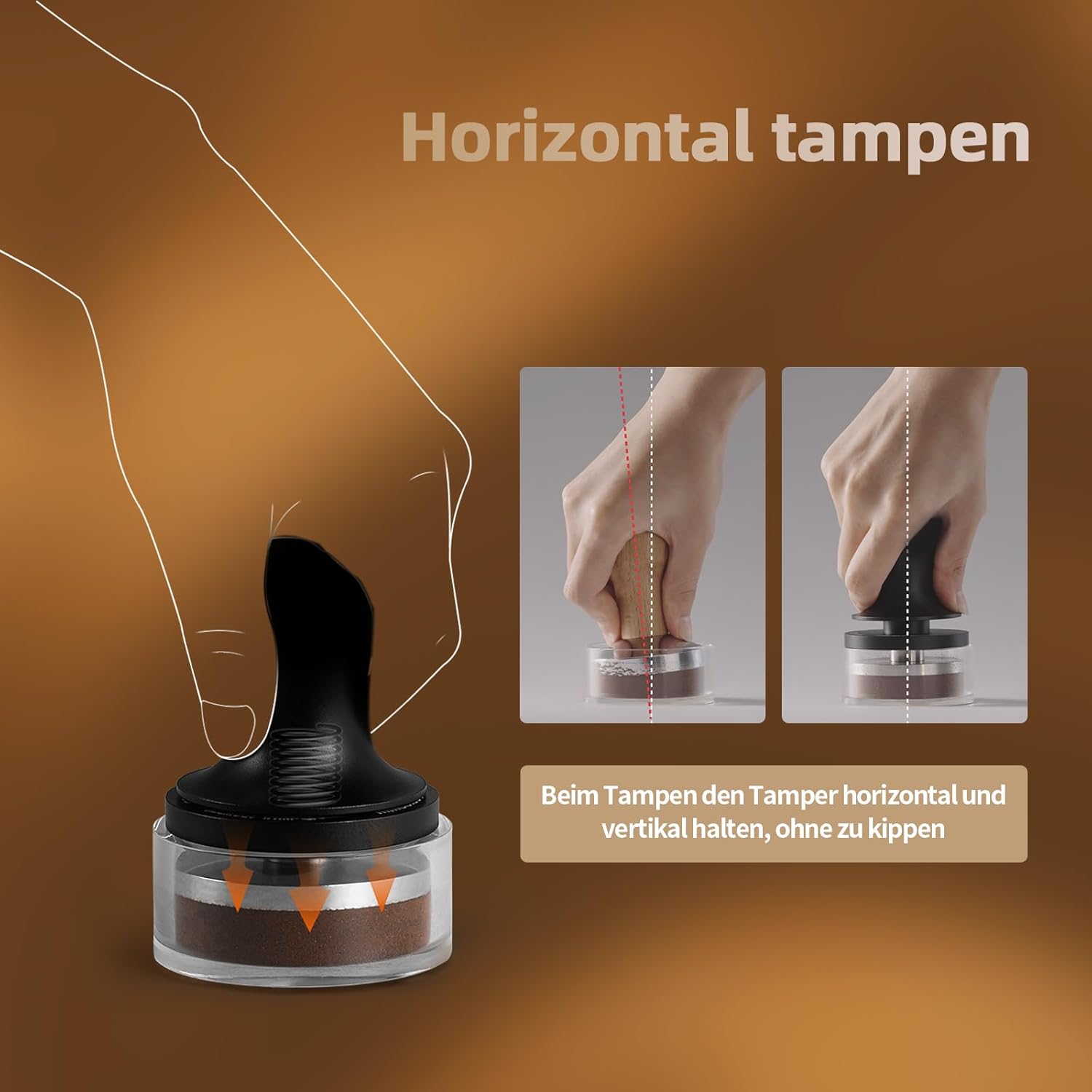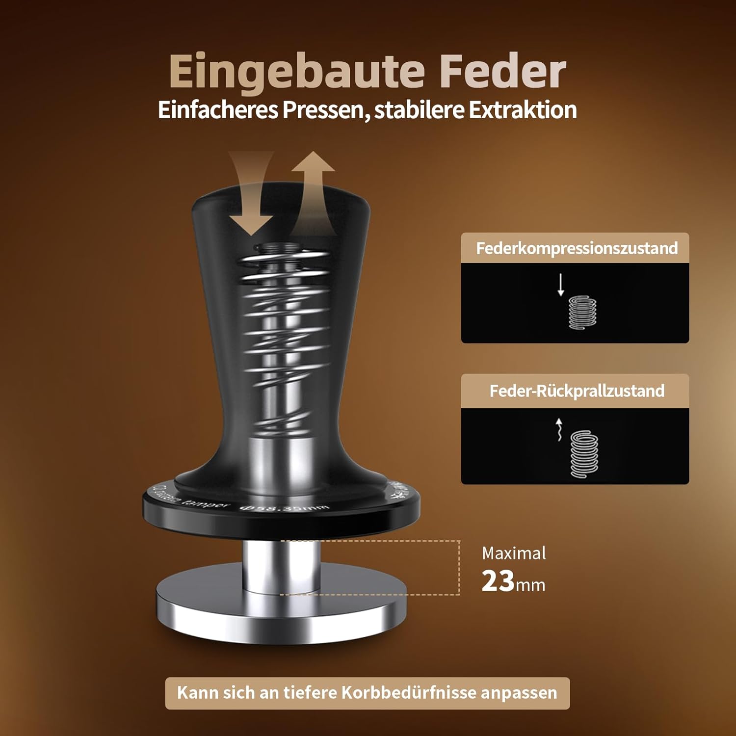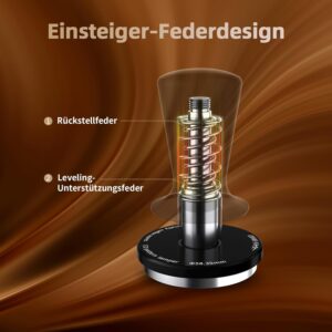 Die innovative duale Federtechnologie ermöglicht eine besonders flexible und konsistente Anpresskraft bei jedem Tamper-Vorgang. Dieses System sorgt dafür, dass sich der Tamper ideal an verschiedene Kaffeesorten, Bohnenkonditionen und Mahlgrade anpassen lässt, was ihn sowohl für Laien als auch für Profis attraktiv macht.