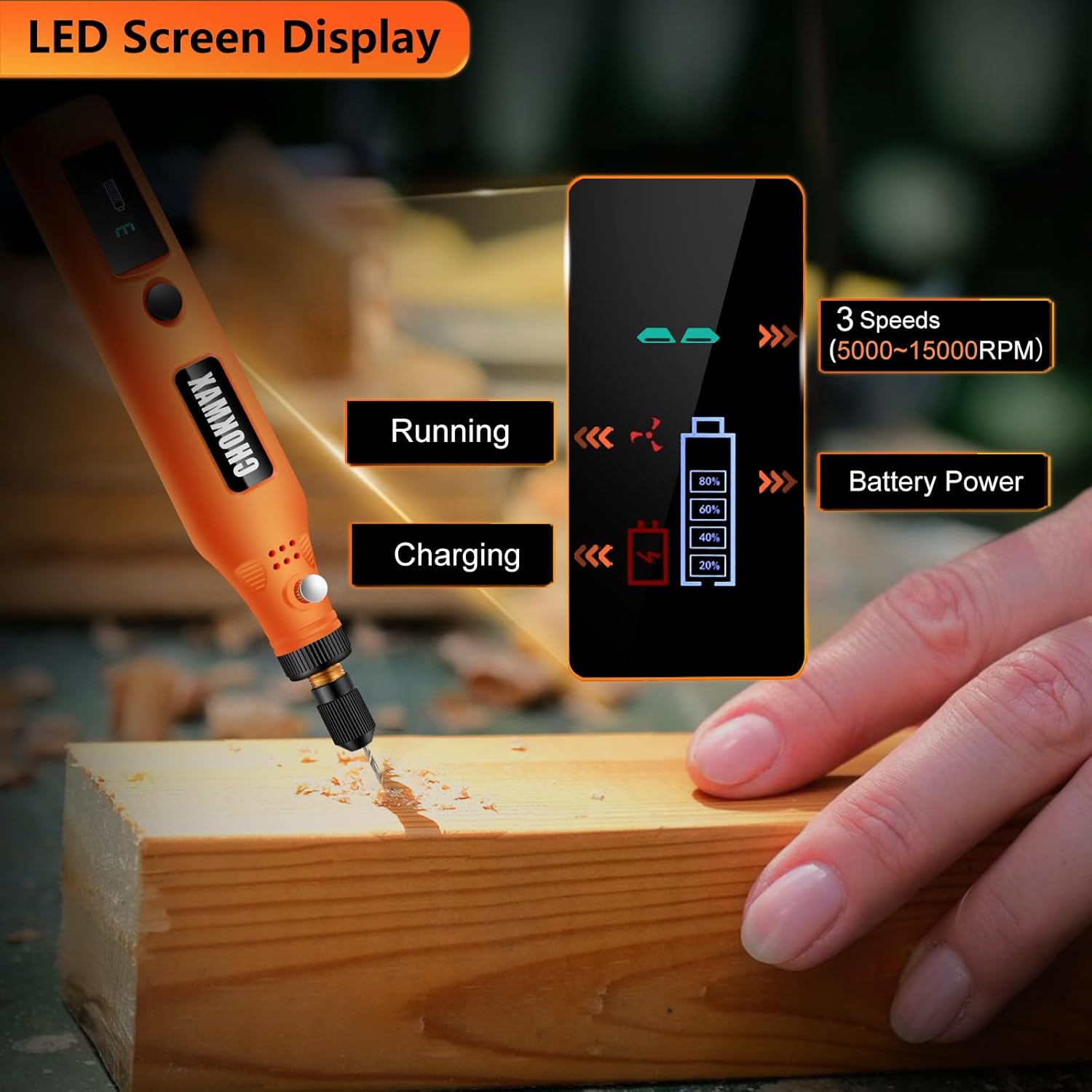 Ein Mini-Multifunktionswerkzeug ist ein kompaktes, vielseitiges Gerät für filigrane Arbeiten wie Schleifen, Polieren oder Gravieren. Die aktuelle Ausführung überzeugt zudem mit einem brandneuen Design inklusive Bildschirm, der Ihnen übersichtlich die verbleibende Batteriekapazität, die aktuelle Arbeitsgeschwindigkeit sowie den Ladestand anzeigt.