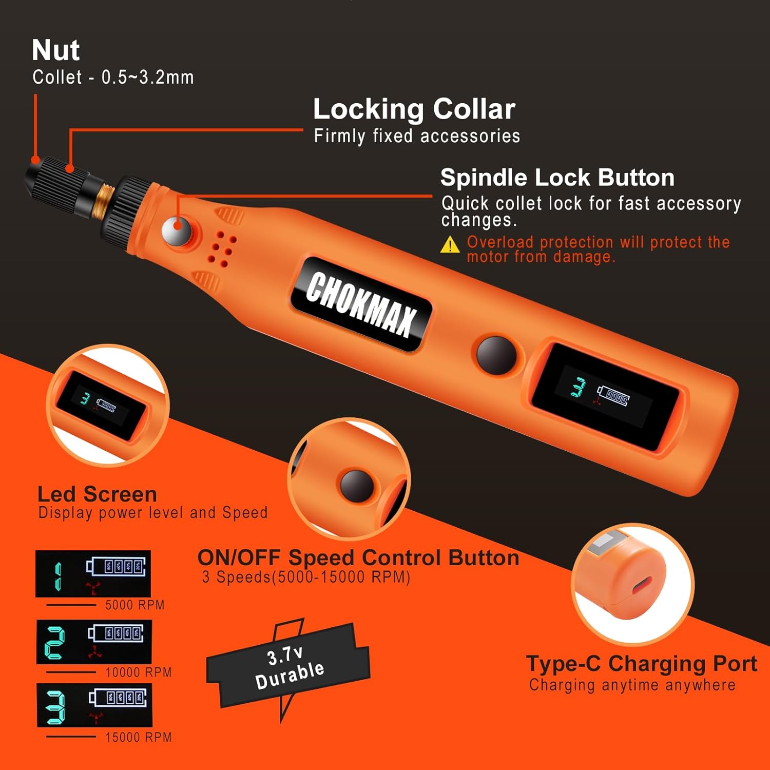 • Variable Arbeitsweise: Drei Geschwindigkeitsstufen (5000/10000/15000 U/min) erlauben eine präzise Anpassung an das Material und die gewünschte Arbeitsintensität.
