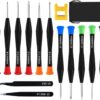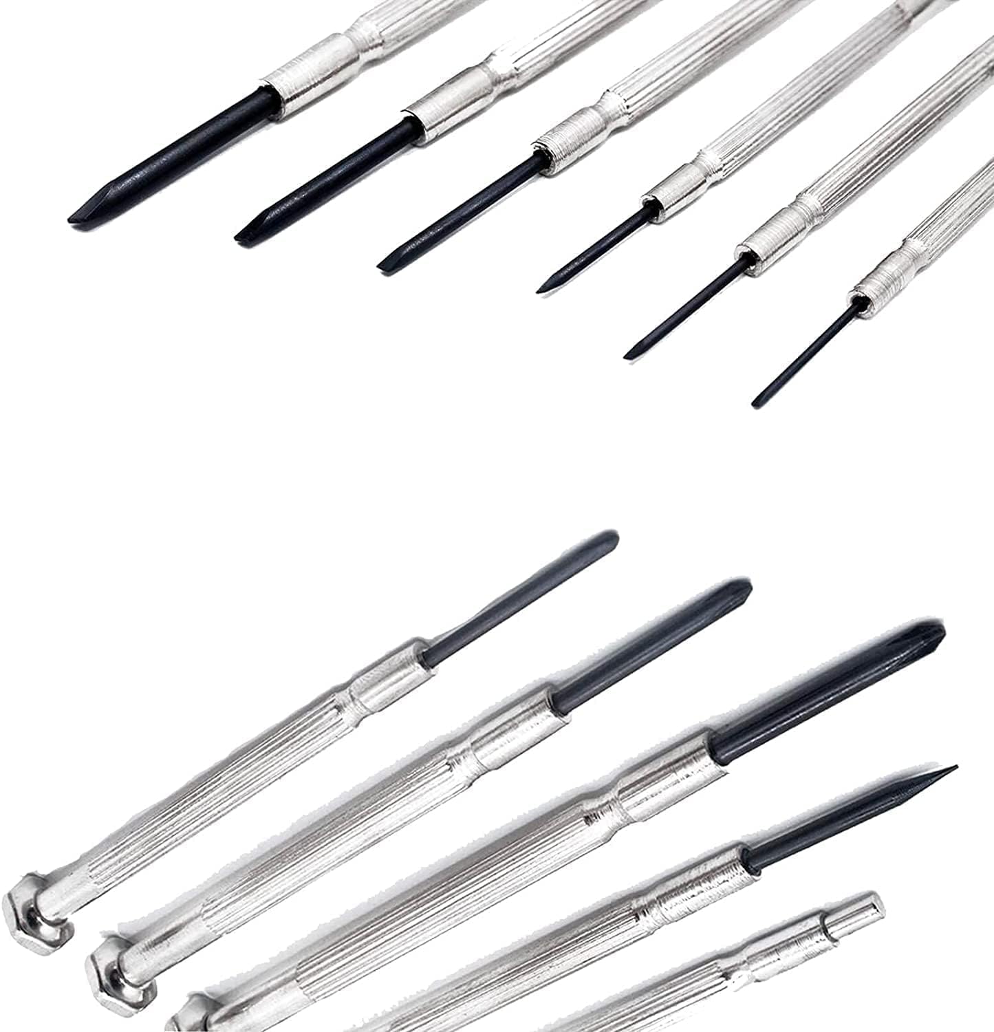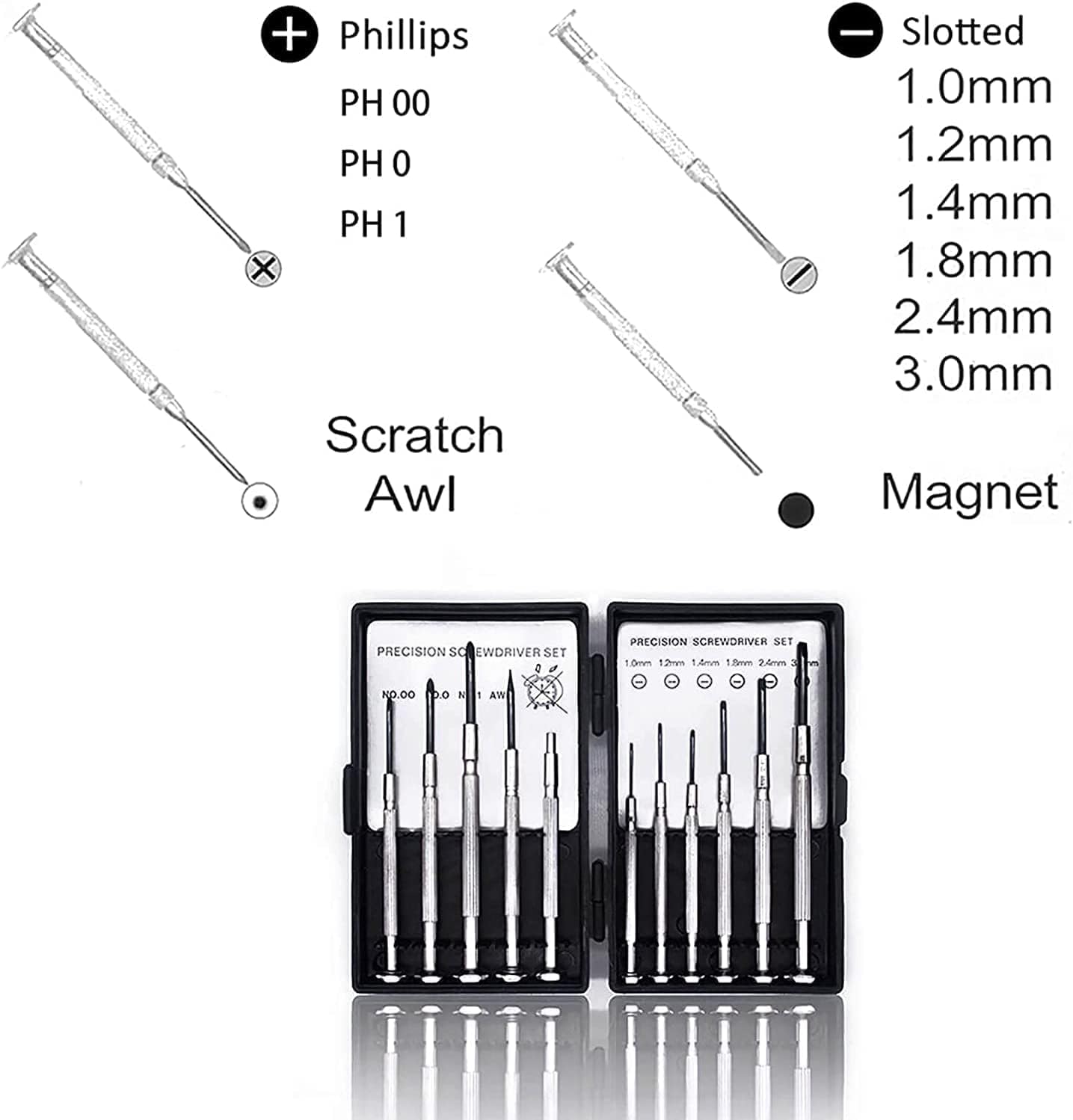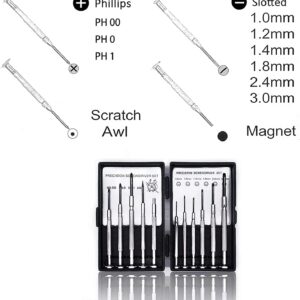- 【11 verschiedene Größen】: 3 Kreuzschlitzgrößen (Nr. 00, Nr. 0, Nr. 1); 6 Flachkopfgrößen (1,0 mm, 1,2 mm, 1,4 mm, 1,8 mm, 2,4 mm, 3,0 mm); 1 Ahle; 1 magnetisch; Das Mini-Schraubendreher-Set ist eine gute Wahl für Uhren, Elektronik, Schmuck, Brillenreparaturen und andere kleine Schraubbefestigungen.