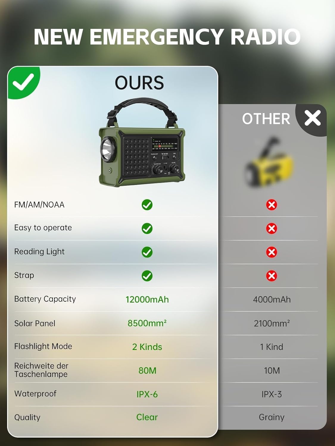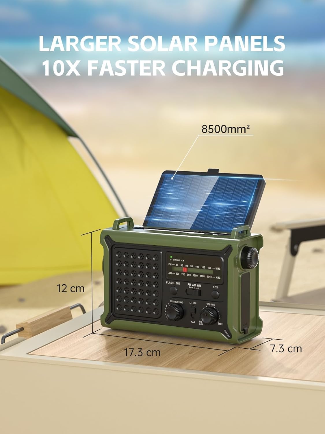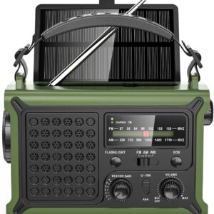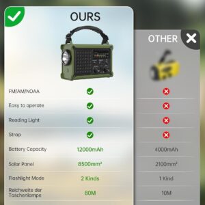 - 8500mm² Solarpanel: Das Solarradio verfügt über ein vergrößertes Solarpanel. Beim Campen im Freien kann das Radio bei voller Sonneneinstrahlung aufgeladen werden, was 10-mal schneller ist als ein normales Solarradio. Sie müssen sich keine Sorgen mehr machen, dass Sie nicht mehr im Freien aufladen können!