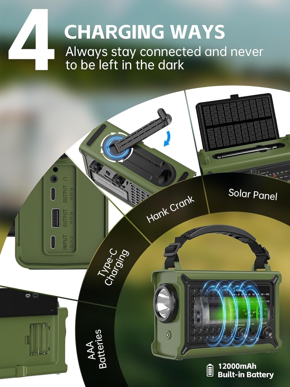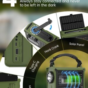 - 4 Lademöglichkeiten + 12000mAh Netzteil mit hoher Kapazität: Laden Sie das Radio mit Solarpanel, Handkurbel, Typ-C-Anschluss oder 3 AAA-Batterien (nicht im Lieferumfang enthalten) auf. Mit der eingebauten 12000mAh Powerbank können Sie Ihr Smartphone oder andere Geräte über einen USB-Anschluss oder einen Typ-C-Anschluss aufladen. Mehrere Backup-Optionen, mit denen Sie auch dann weitermachen können, wenn es keinen Stromausfall oder Stromausfall gibt!