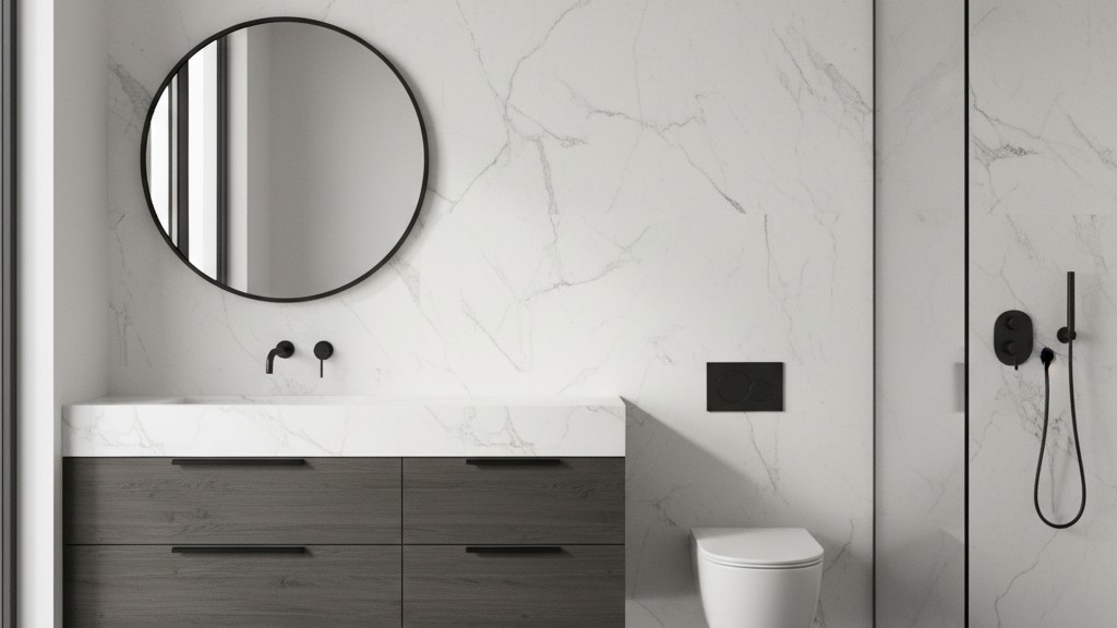 Vergiss glänzendes Chrom. Mattschwarze Armaturen sind das Anker-Element. Wichtig: Wähle eine PVD-Beschichtung. Alles andere wird bei hartem Leitungswasser zur Geduldsprobe. Ich installiere in Projekten meist Unterputz-Armaturen, weil die Wandfläche sauberer bleibt und der Kontrast auf einer großformatigen, weißen Fliese besser zur Geltung kommt. Die Reduktion auf das Wesentliche ist hier der Trick. Kombiniere eine schlanke Einhebel-Armatur mit einem schlichten Auslauf. Das wirkt ruhig und professionell.