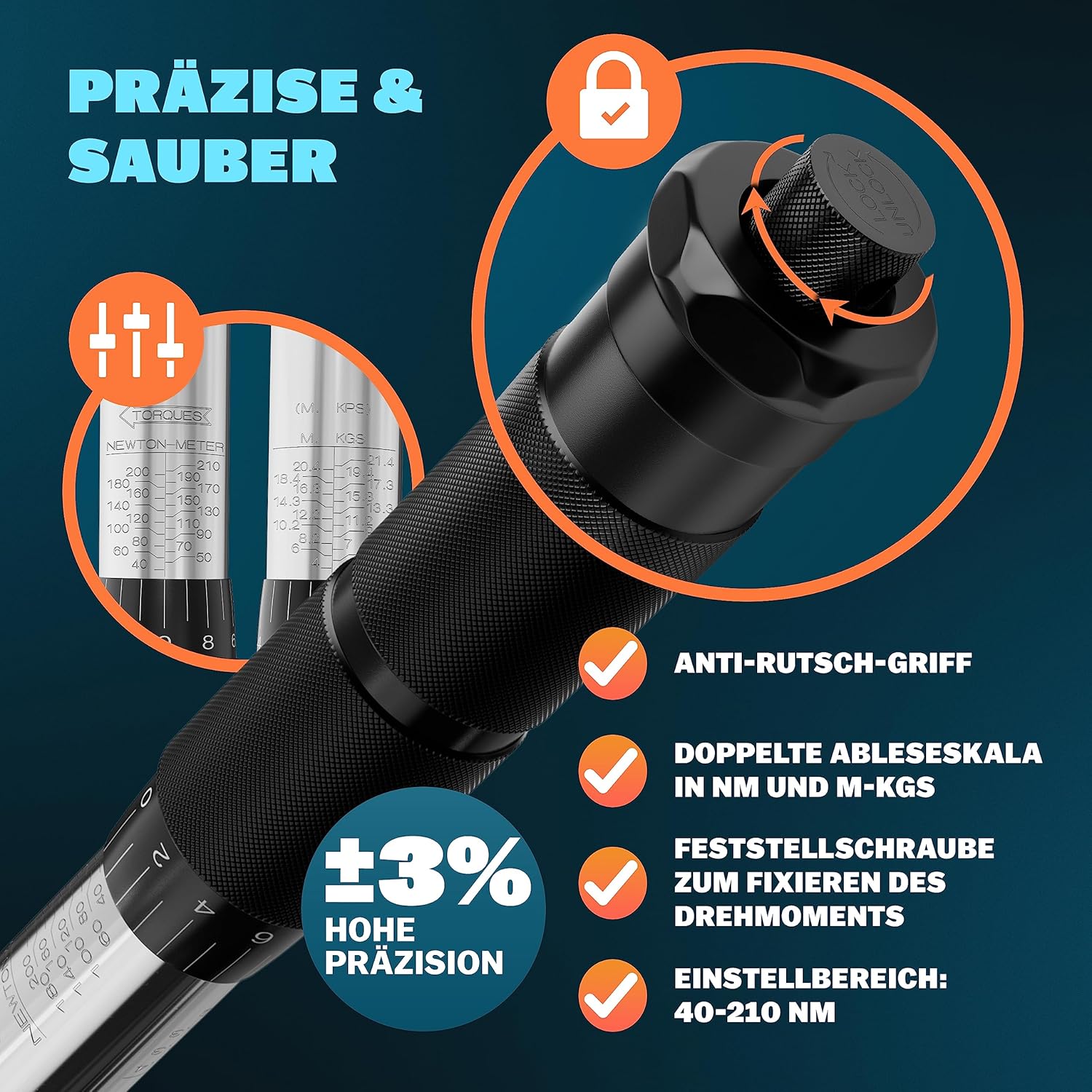- Exakte 40-210 Nm Skala: Deckt den Standardbereich für nahezu alle PKW-Radschrauben ab, ohne dass du den Drehmomentschlüssel ständig nachjustieren musst.