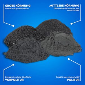 Das Set ist sehr ergiebig und darauf ausgelegt, eine Gesamtmenge von bis zu 9 kg an Steinen oder anderen Materialien zu bearbeiten. Dank der hochwertigen Zusammensetzung des Siliziumkarbids sorgt es für ein glänzendes Endergebnis.