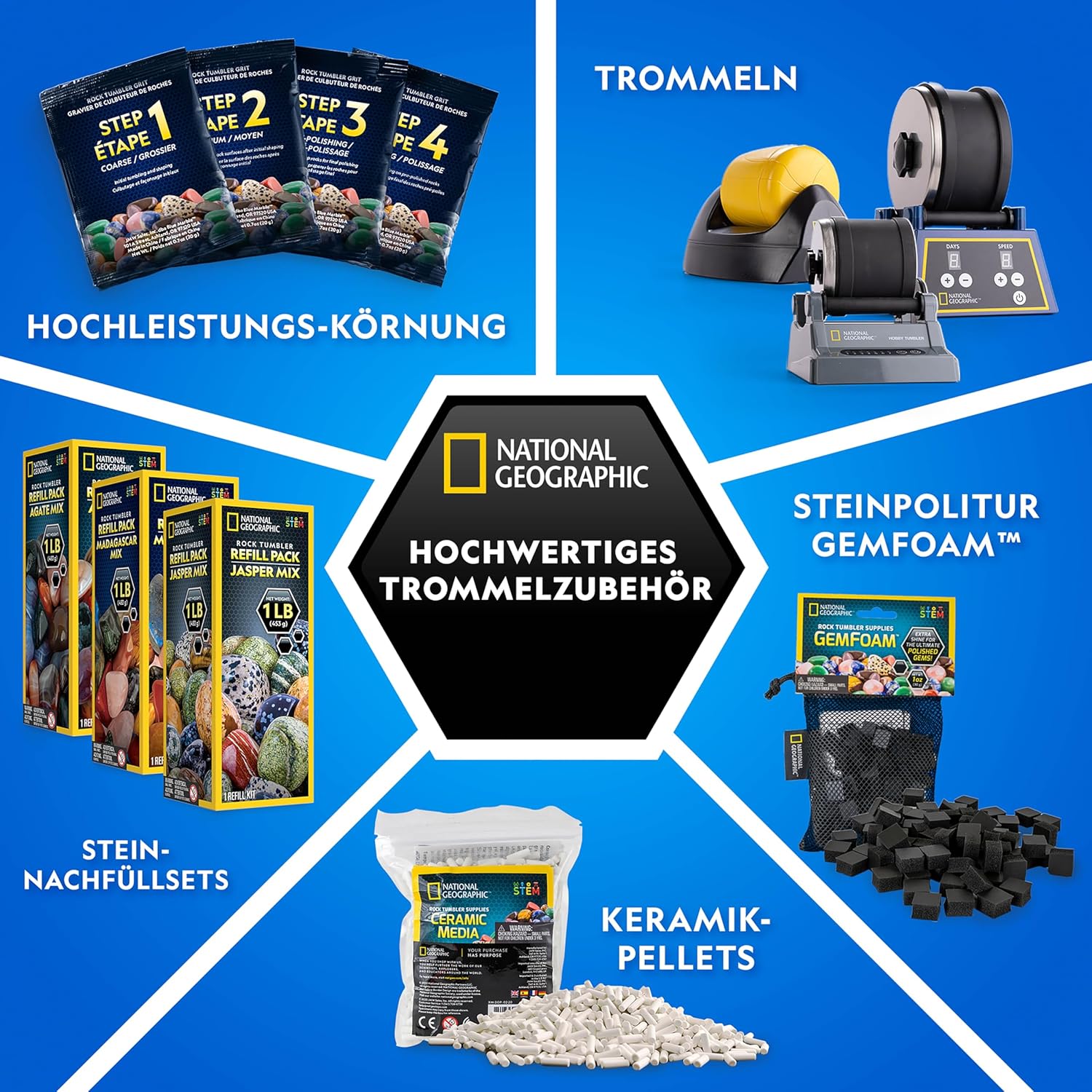 Dieses Schleif- & Poliermittel Nachfüllset von National Geographic ist die perfekte Lösung für engagierte Hobby-Geologen und Besitzer von Steintrommeln, die ihre Fundstücke in professionelle Sammlerstücke verwandeln möchten. Mit diesem Set bearbeitest du effizient bis zu 9 kg Gestein, Edelsteine oder Glas und erzielst exzellente Ergebnisse bei der Oberflächenveredelung.