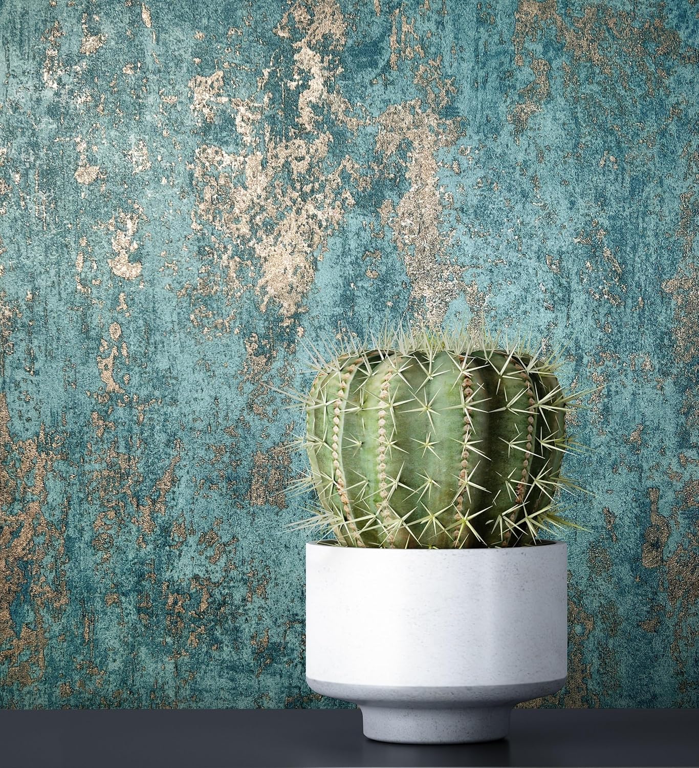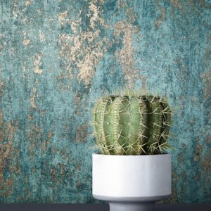 Die Tapete im Industrial Chic kombiniert eine moderne Putz- und Zementoptik mit edlen Türkis-Grau- und Anthrazit-Nuancen. Durch die metallischen Glanzeffekte entsteht ein glamouröser Hingucker, der jedem Raum eine stilvolle Loft-Atmosphäre verleiht. Sie harmoniert besonders gut mit schwarzen Ledermöbeln und modernen Chrom-Details.