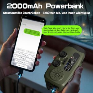 - đăIntegrierter 2000mAh-Akku als Notstrom-PowerbankăSeien Sie vorbereitet mit diesem essenziellen Notfallradio, das einen fest eingebauten 2000mAh-Akku besitzt, der auch als Kurbelradio-Powerbank fungiert. Laden Sie im Krisenfall leicht Ihr Handy oder kleine GerĂ€te â so bleiben Sie stets verbunden, wenn es darauf ankommt. Ein zuverlĂ€ssiges Radio mit Kurbel fĂŒr jede Notsituation.