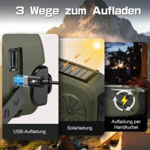 - âĄăDreifach-Stromversorgung: Kurbel, Solar & USBăNie mehr ohne Energie: Dieses vielseitige Kurbelradio bietet drei zuverlĂ€ssige Ladewege â USB, Solar-Ladung oder per Handkurbel. Das macht das Solar Radio mit Kurbel+Radio-Funktion ideal bei StromausfĂ€llen, Camping oder in jeder Situation ohne Netzanschluss. Ein absolut resilienter Notfallradio Testsieger.