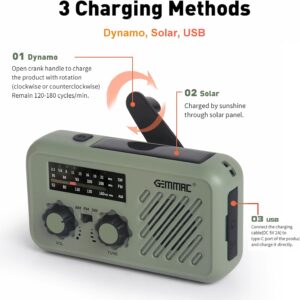 - AM / FM / SW RADIO – Das tragbare Notfallradio von Gemmac unterstützt die Bänder AM /AFM/ SW. Sie können von AM, FM auf SW umschalten, um die tägliche Vorhersage schnell zu erhalten. FM / AM-Radio hat guten Empfang, auch wenn die Antenne ausgeschaltet ist (AM530-1710 kHz, FM87-108 MHz, SW7-19 MHz) sowie Kurzwellensender.
