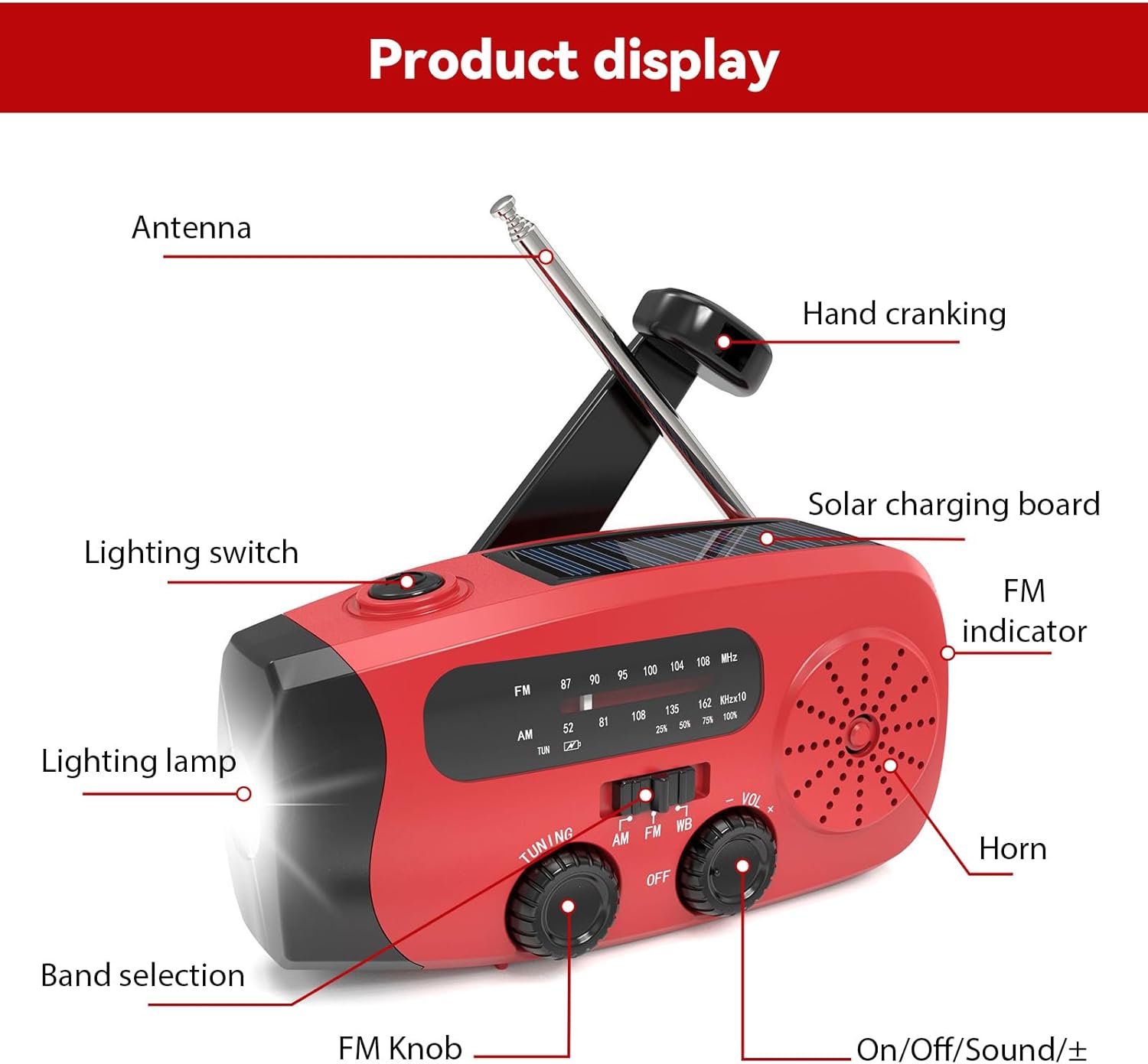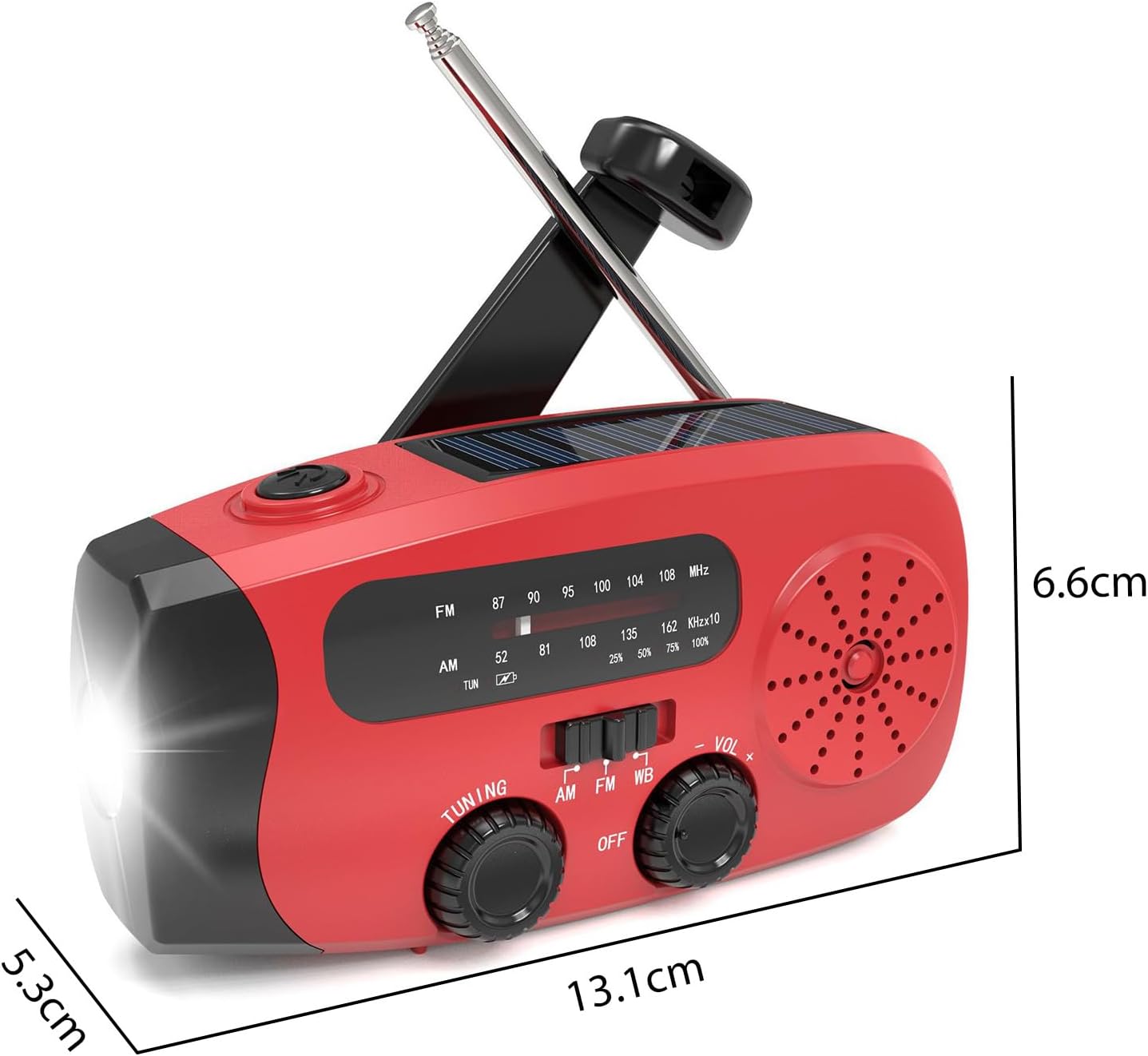 • 📻 Klarer Empfang: Das Kurbelradio empfängt Wetterberichte und AM/FM-Sender mit einem stabilen und klaren Signal. Der integrierte 2000-mAh-Lithium-Akku ermöglicht lange Nutzungsdauer und kann zusätzlich als Powerbank zum Laden von Mobiltelefonen und anderen Geräten verwendet werden, damit Sie in kritischen Momenten immer erreichbar sind.