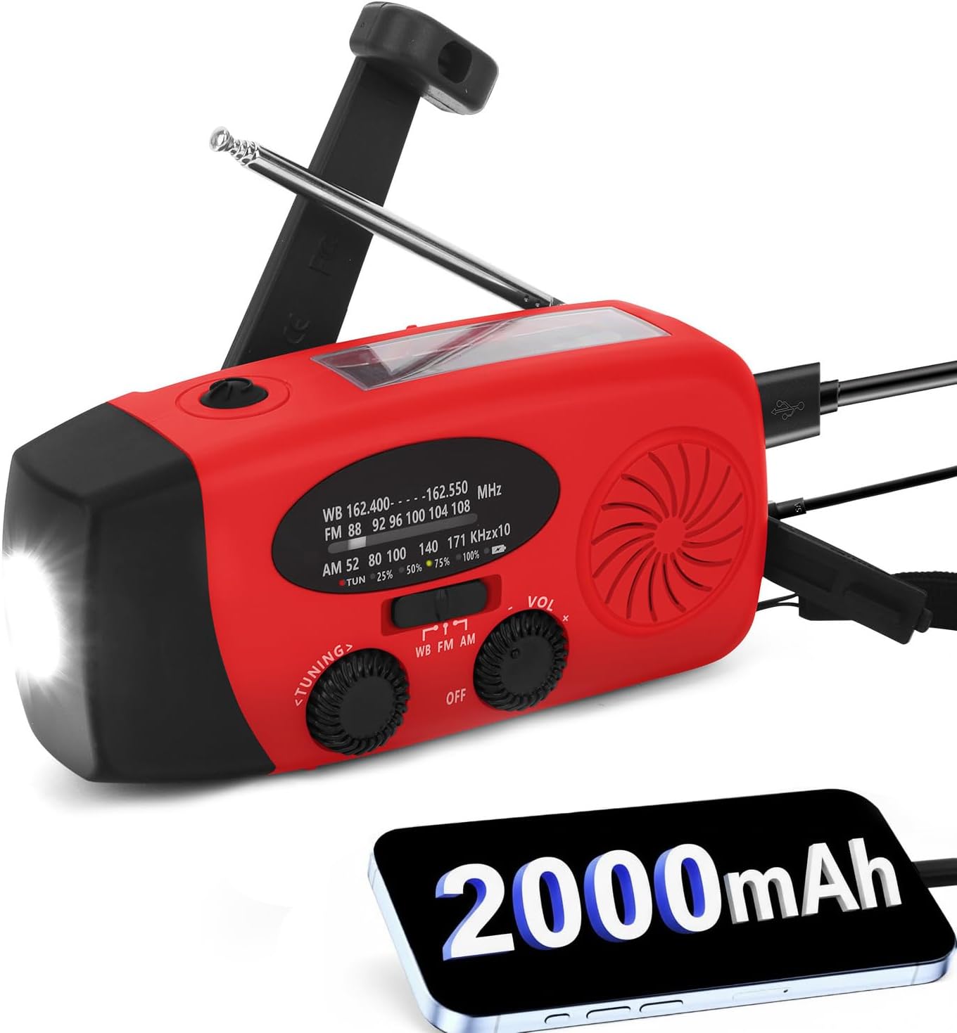 - 2000-mAh-Powerbank: Ausgestattet mit einem 2000-mAh-Li-Ionen- kann dieses Radio die meisten USB-Geräte aufladen und liefert so die notwendige Energie, um die Familie oder den Notdienst anzurufen oder in Notsituationen Hilfe anzufordern.Bleiben Sie in Verbindung und mit Strom versorgt, wo auch immer Sie sind.