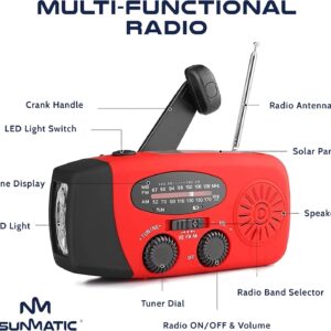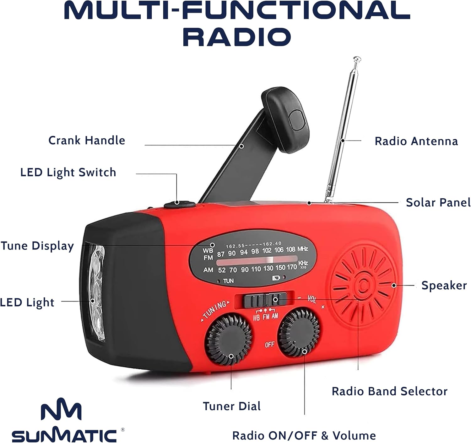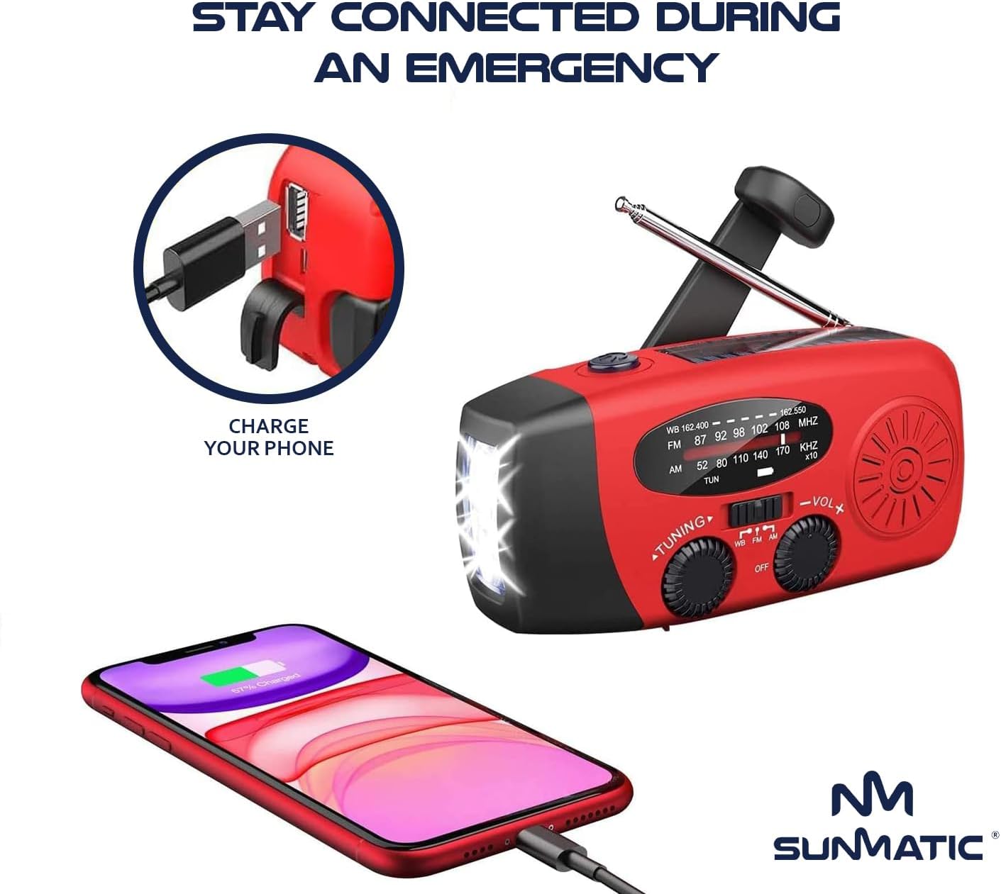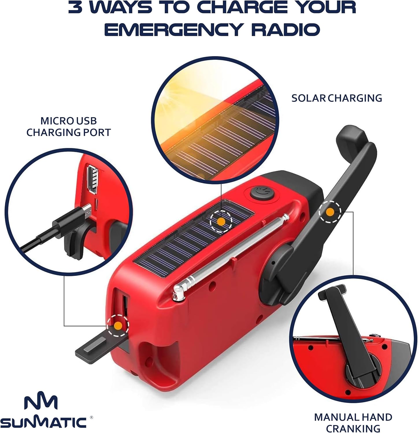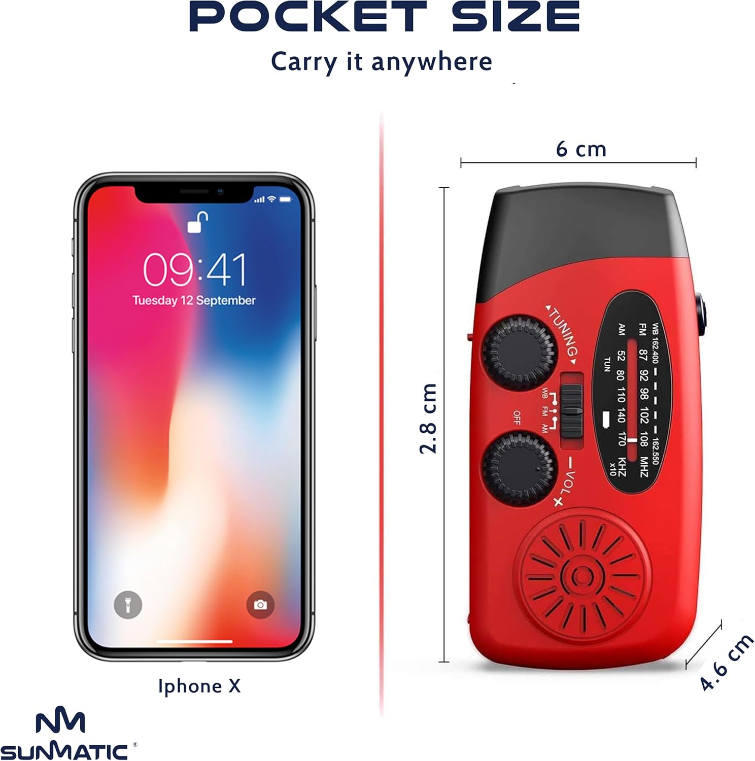 Notfallradio mit Kurbel, Solar & LED – Sunmatic – Tragbares AM/FM Radio mit 2000mAh Powerbank & USB-Ladefunktion – Für Stromausfall, Outdoor, Camping & Notfallset – Sunmatic