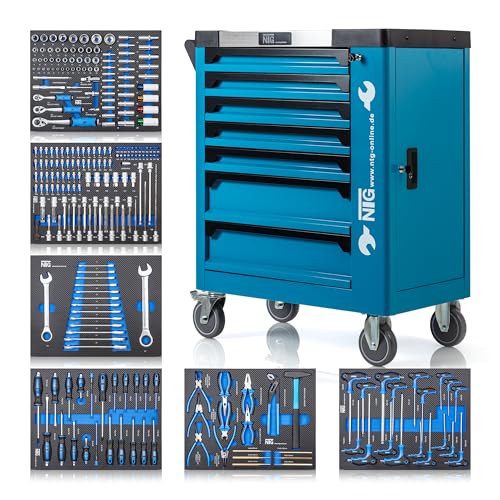NTG Werkzeugwagen bestückt mit Werkzeug + 7 Schubladen | 252 Teilig | Abschließbar | Davon 6 mit Werkzeug | Mit Soft Inlays in Carbonoptik | Werkstattwagen gefüllt Werkzeugkasten