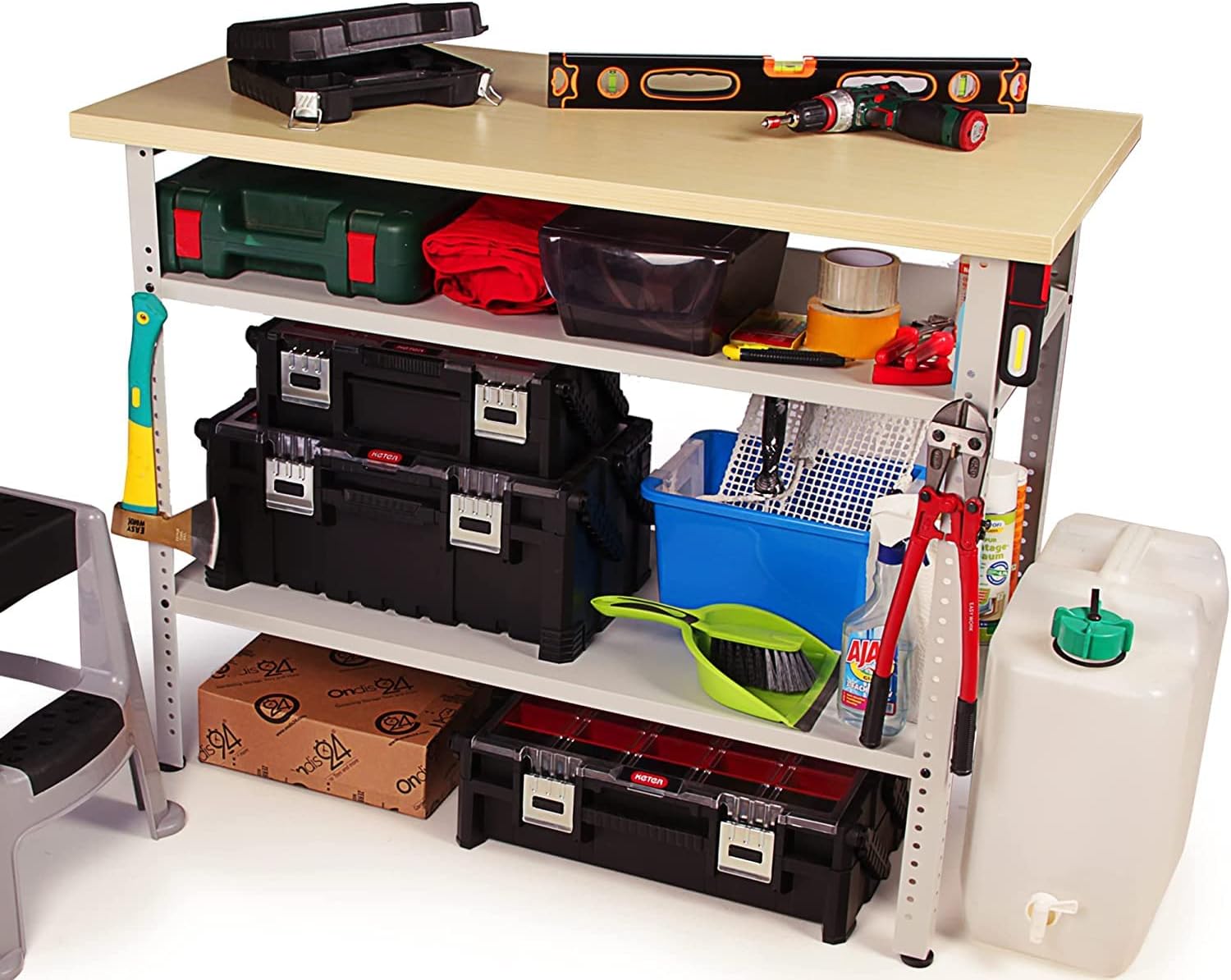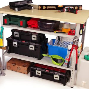 - Besonderes Feature: Die großen Ablagen sind höhenverstellbar, so kannst du deine Werkbank perfekt an Dein Werkzeug oder Deine Werkzeugkoffer anpassen