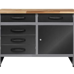 Ondis24 Werkbank Metall mit Schubladen, Schubladen & Türen, Werkstatt Metall 120 cm, Werktisch 120cm, Montagewerkbank, 28mm Buchenholzarbeitsplatte (120 cm und 5 Schubladen)