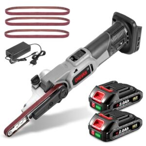 ONEVAN Akku Bandschleifer, Elektrische Bandfeile mit 2 2000mAh Akkus, 6 Geschwindigkeiten, 35° Einstellbare, Elektrofeile Fingerschleifer Bandschleifmaschine inkl. 3 Schleifbändern