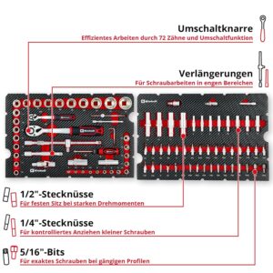- • 92-teiliges Set: Volle Ausstattung von Stecknüssen bis Bits in einem Koffer, damit kein Suchen nach passendem Werkzeug mehr nötig ist.