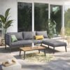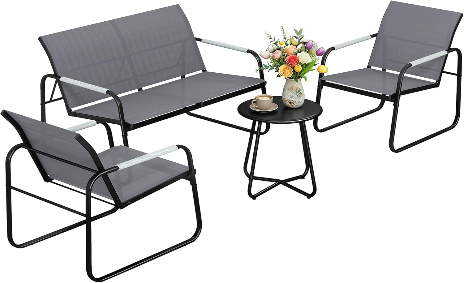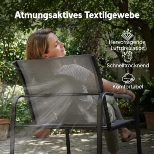 Das Set überzeugt durch einen vielseitigen, modernen Stil, der durch schwarze Rahmen, graues Netzgewebe und seil-inspirierte Armlehnen geprägt ist. Dieses klare Design fügt sich nahtlos in verschiedene Umgebungen ein, sei es am Pool, auf dem Balkon oder mitten im Garten.