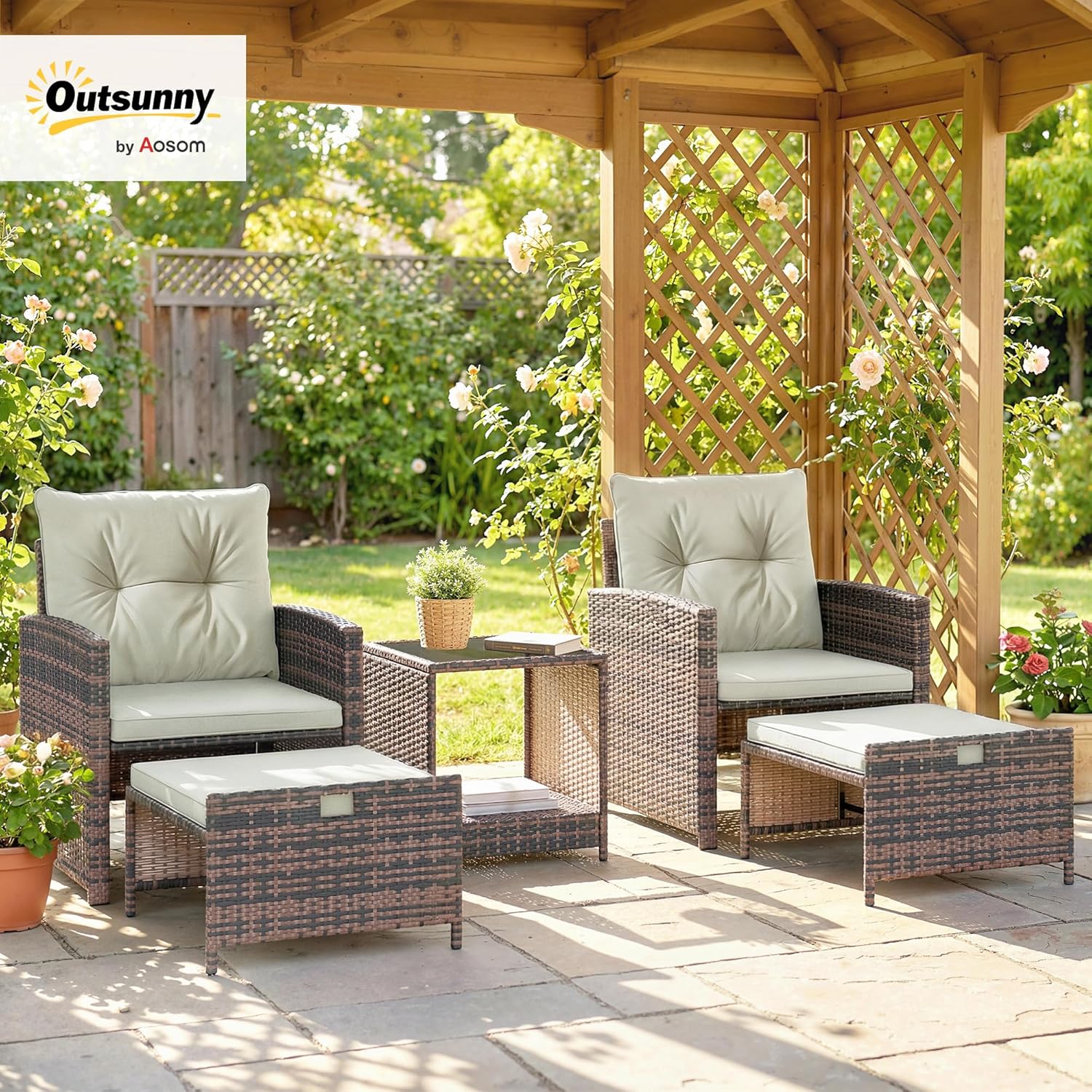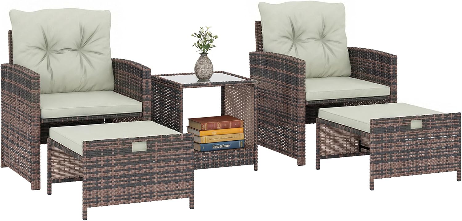 Outsunny Rattan Gartenmöbel Set 5-teiliges Balkonmöbel Set mit 2 Stühle Kissen Hocker Tisch Staufach, Gartenlounge Terrassenmöbel Gartengarnitur Sitzgruppe für Garten, Balkon, Terrasse Cremeweiß