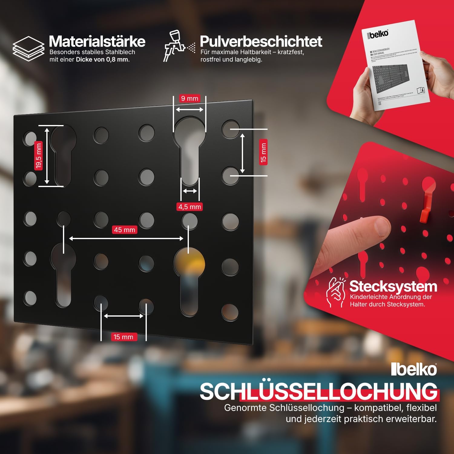 Die Installation der Lochwand ist dank des durchdachten Pegboard-Systems unkompliziert gestaltet und ermöglicht eine schnelle Montage an Ihrer Wand. Sie schaffen damit im Handumdrehen eine strukturierte Arbeitsfläche, die genau auf Ihre individuellen Bedürfnisse in der Werkstatt oder im Hobbybereich zugeschnitten ist.