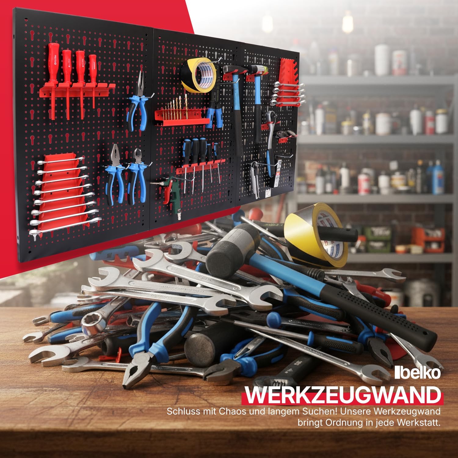Die Werkzeugwand zeichnet sich durch ihr flexibles Pegboard-System aus, das für Ordnung in verschiedenen Räumen wie Werkstätten, Garagen, Hobbykellern oder Büros sorgt. Durch die modulare Gestaltung haben Sie Ihr Werkzeug stets griffbereit und behalten durch die übersichtliche Anordnung jederzeit den vollen Überblick über Ihre Ausstattung.